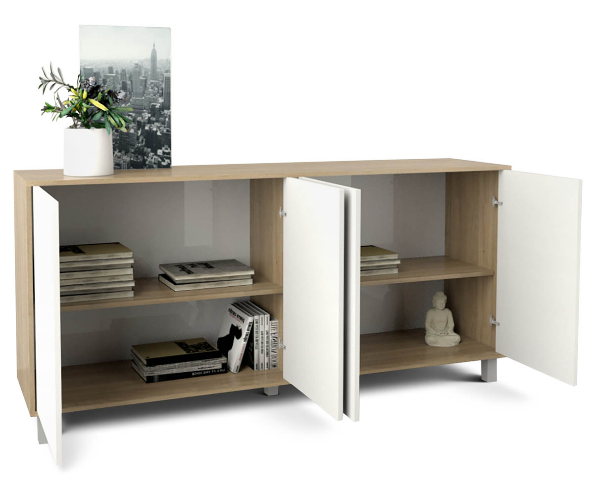Bahiut Modular con diseño moderno fabricado en MDF. Cuenta con cuatro puertas con sistema Push y dos estantes.
