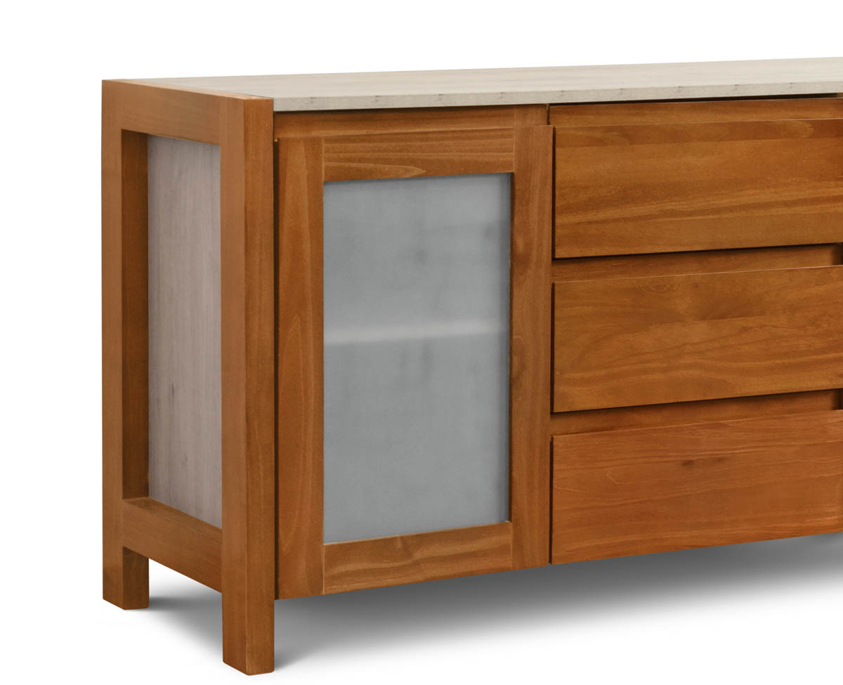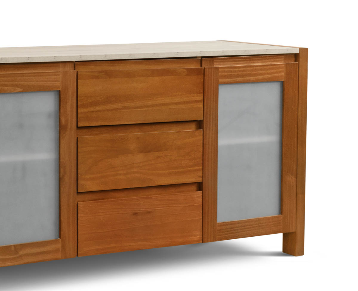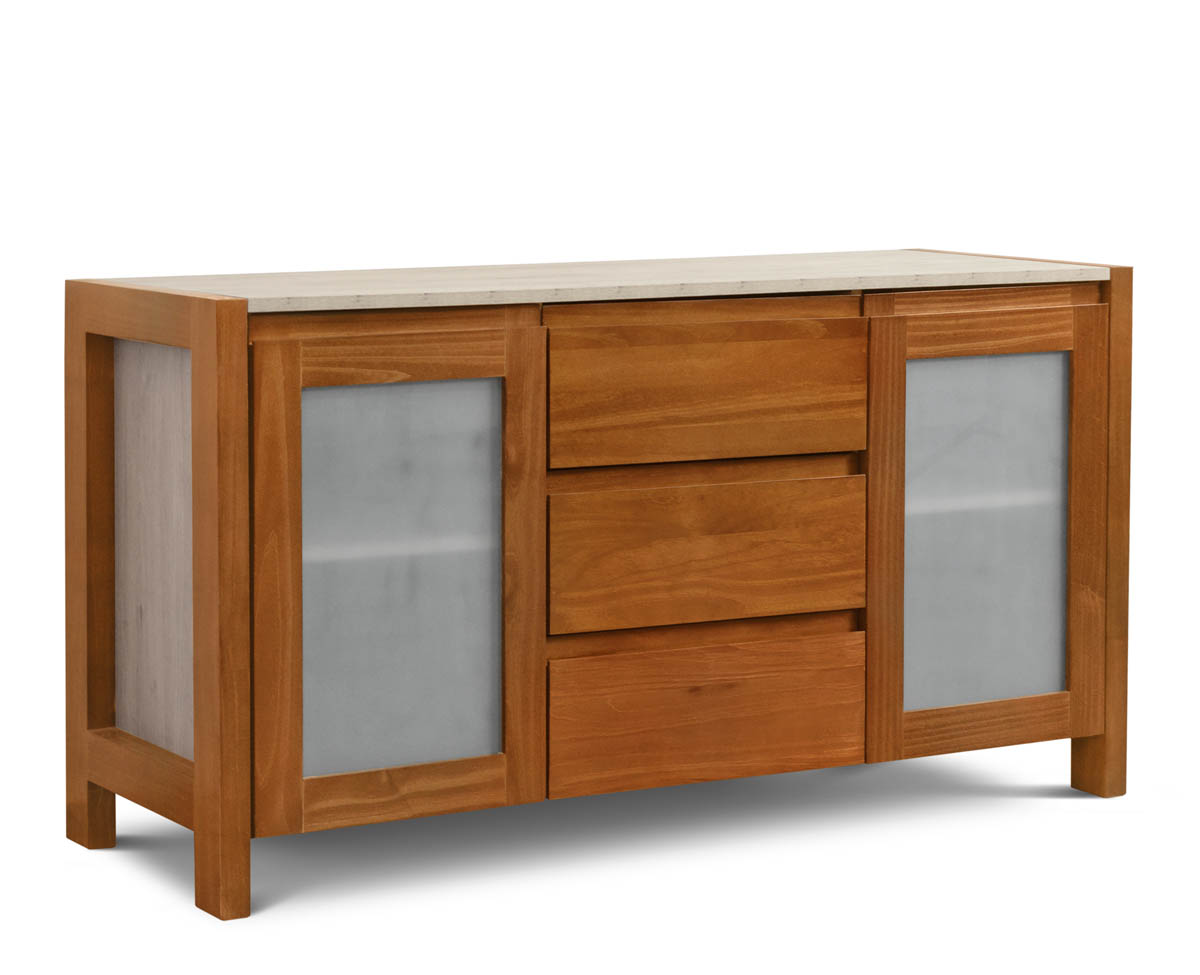 Bahiut con diseño combinado de Madera Maciza y MDF. Compuesto por dos puertas con vidrio, estantes internos y 3 cajones montados sobre correderas metálicas.