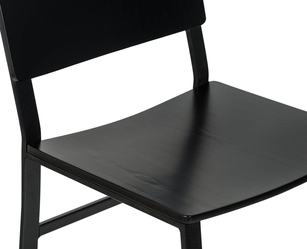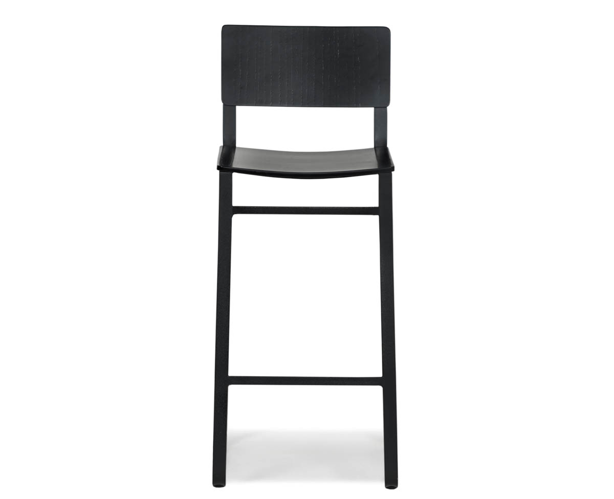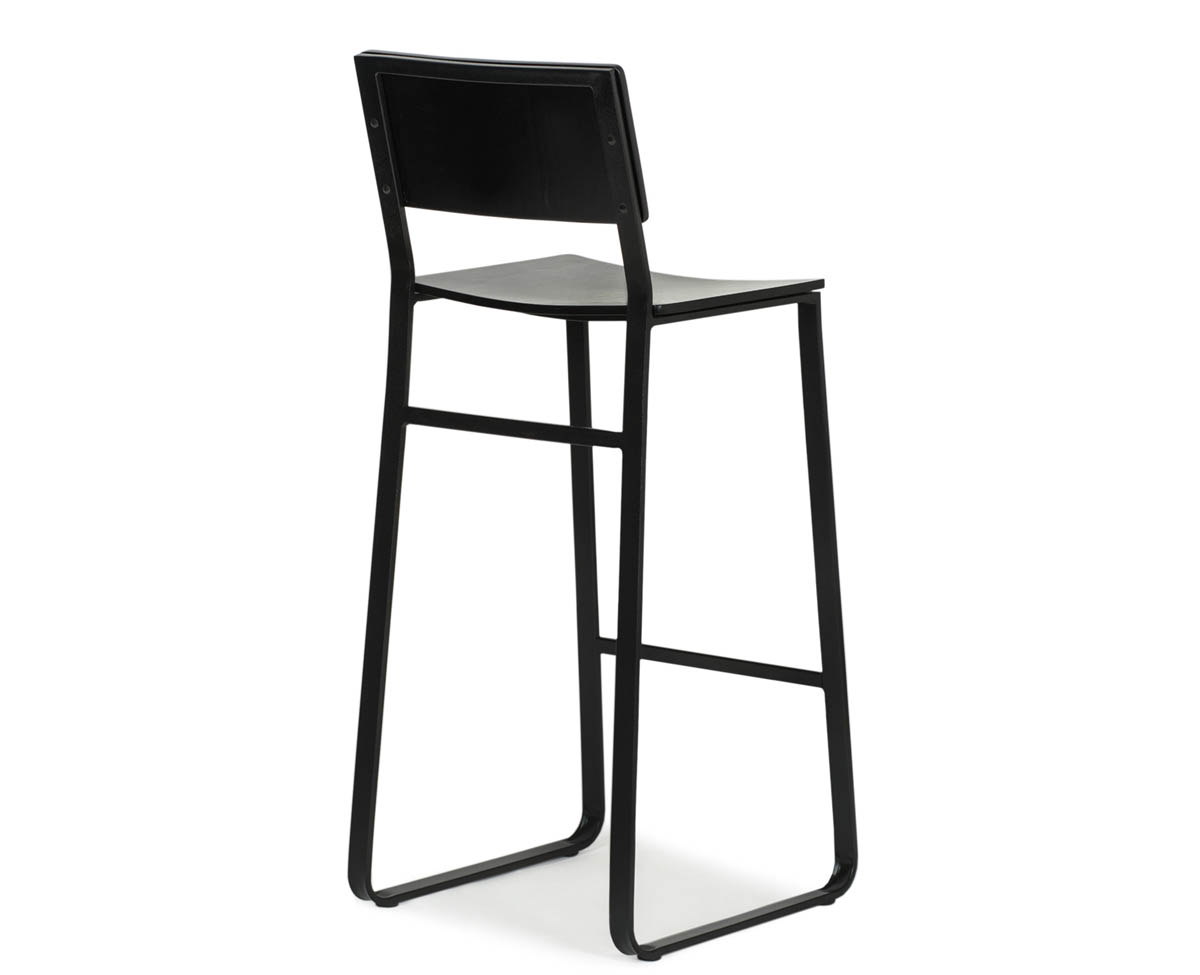 Banqueta alta con respaldo fabricada en caño con asiento de madera.