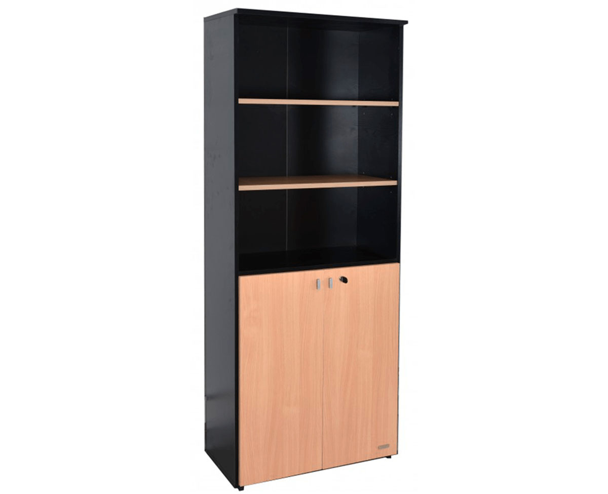 Biblioteca con puertas bajas, estantes regulables y cerradura. Fabricada en melamina.