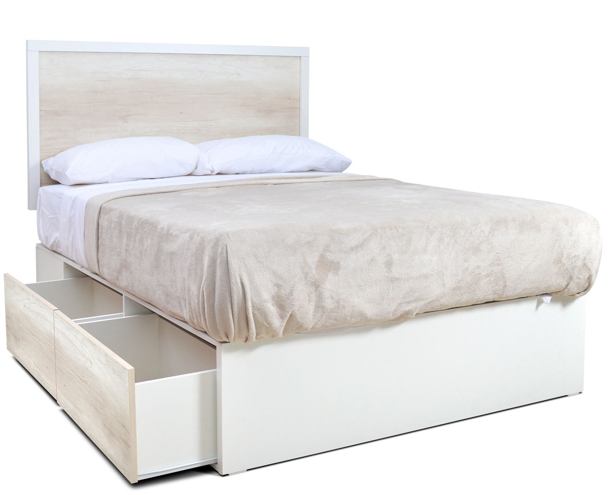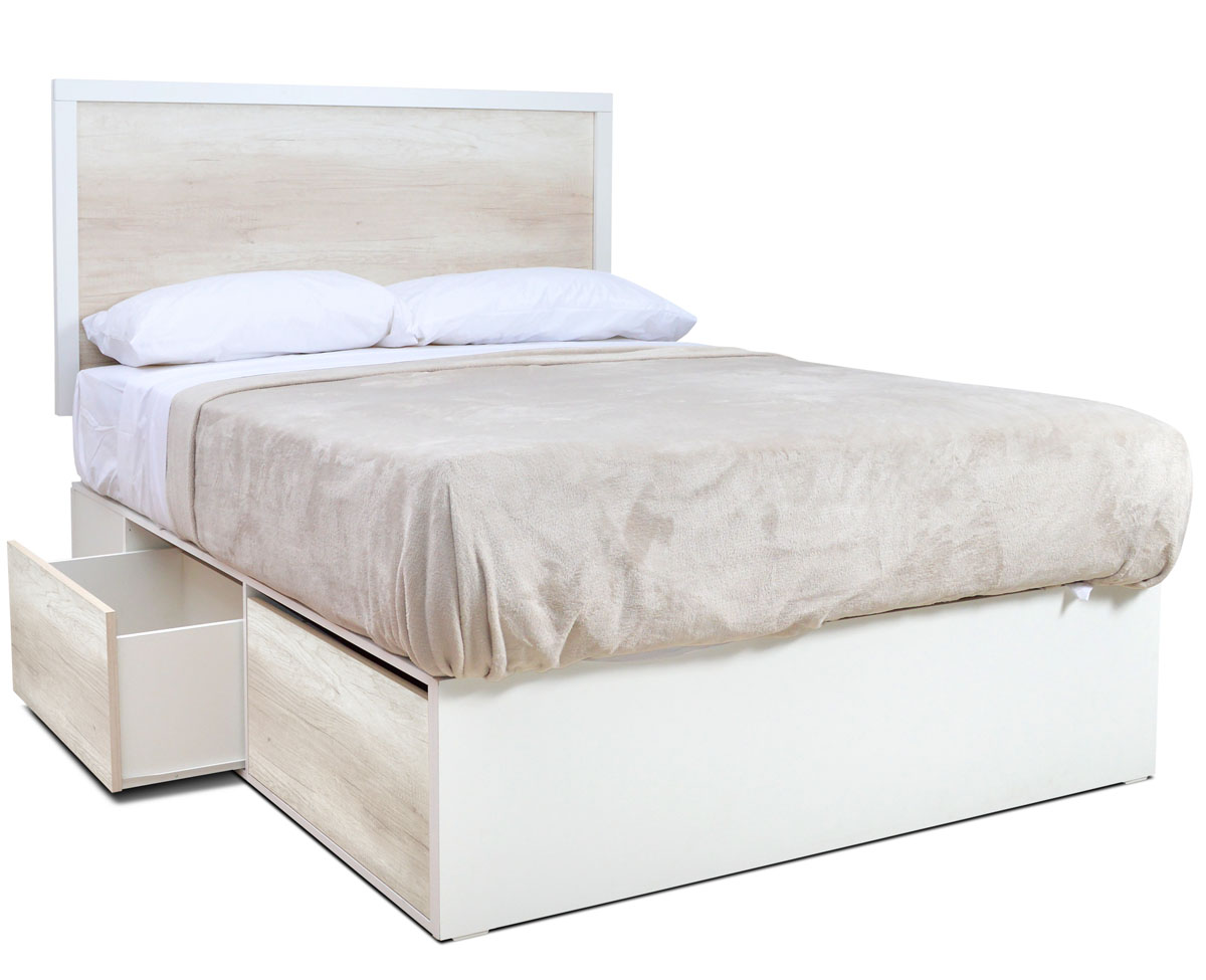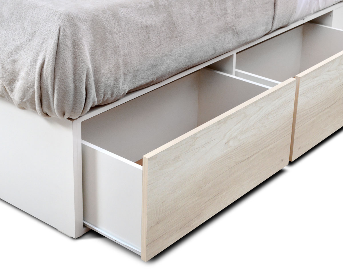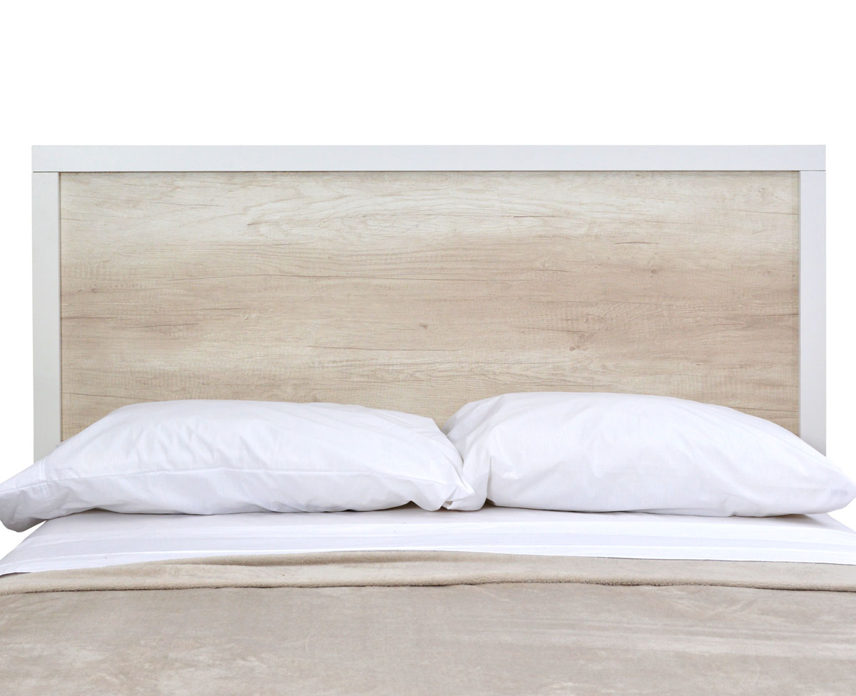 Dormitorio compuesto por Respaldo y Box fabricado en melamina. El Box posee 4 cajones laterales (2 en cada lateral) montados sobre correderas metálicas.