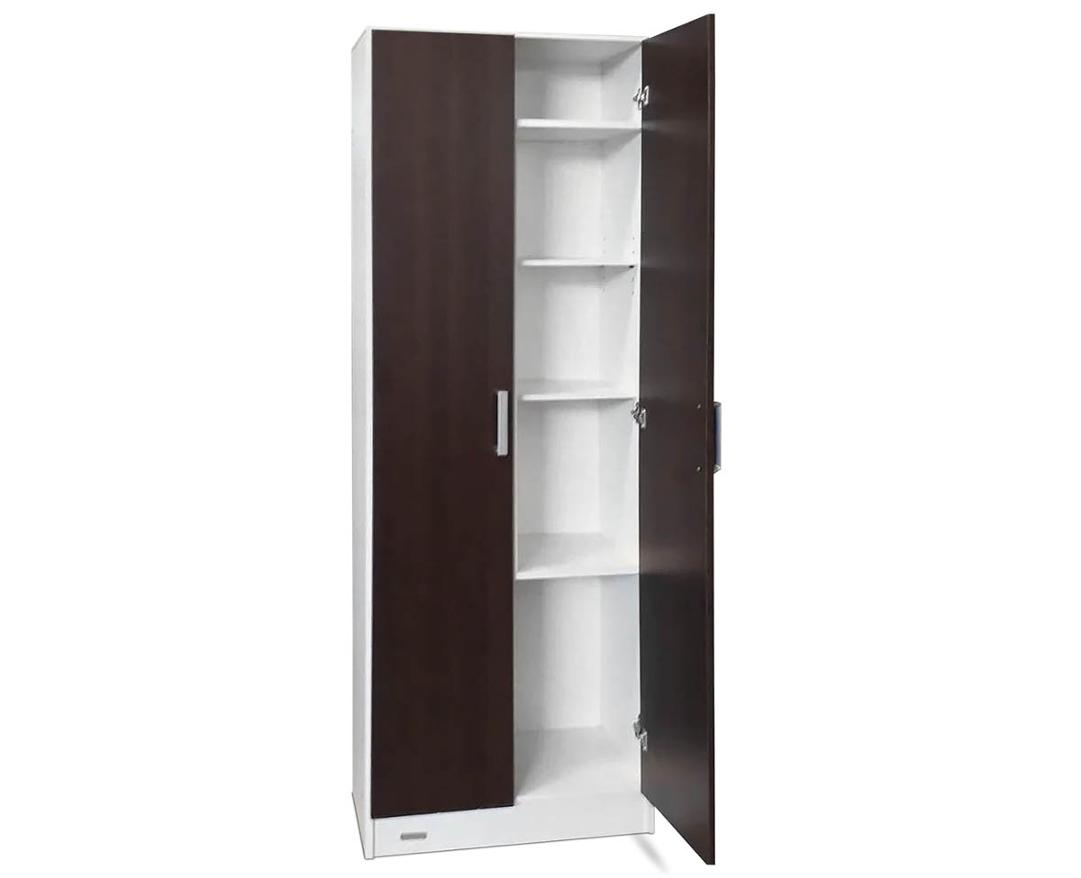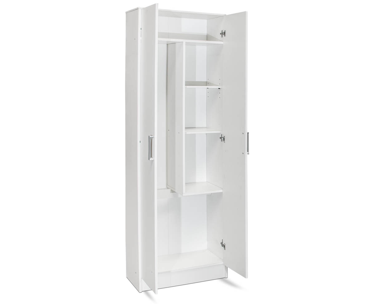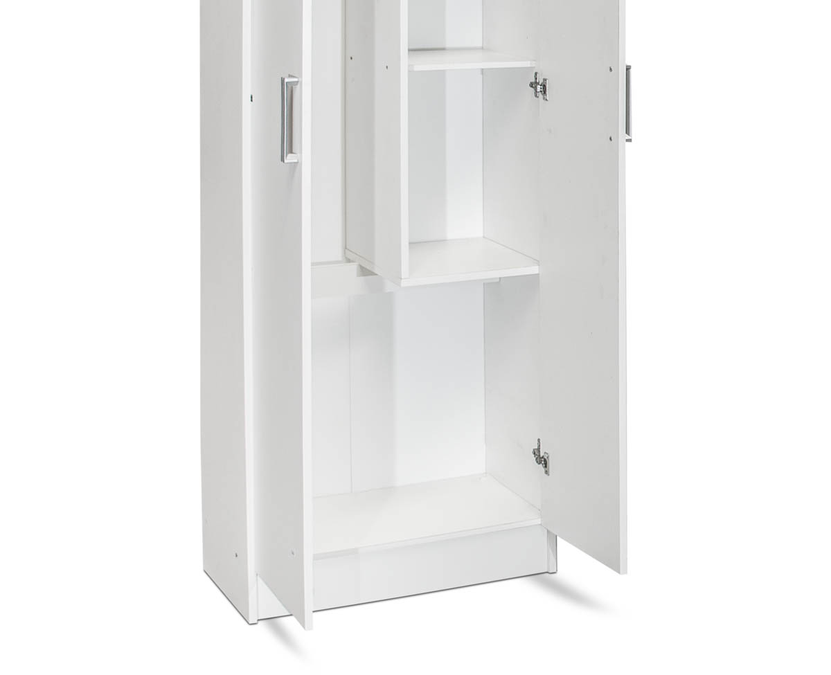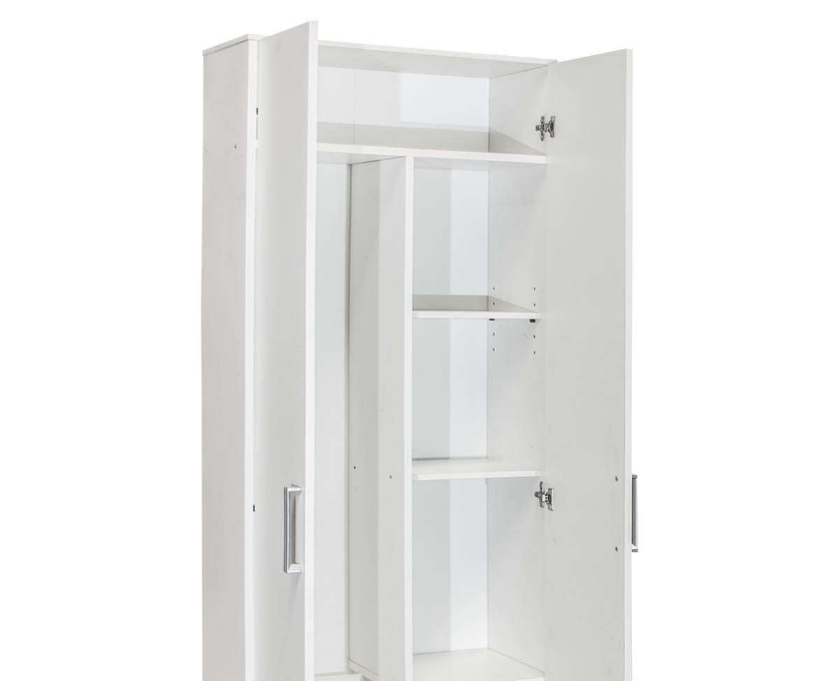 Escobero organizador compuesto por 2 puertas y 4 estantes revestidos. Bisagras metálicas.