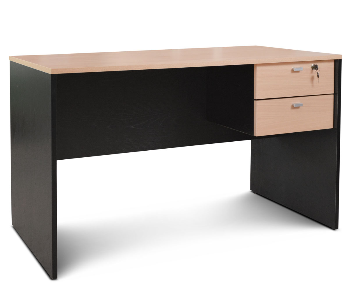 Escritorio fabricado en melamina. Compuesto por 2 cajones, 1 con cerradura.