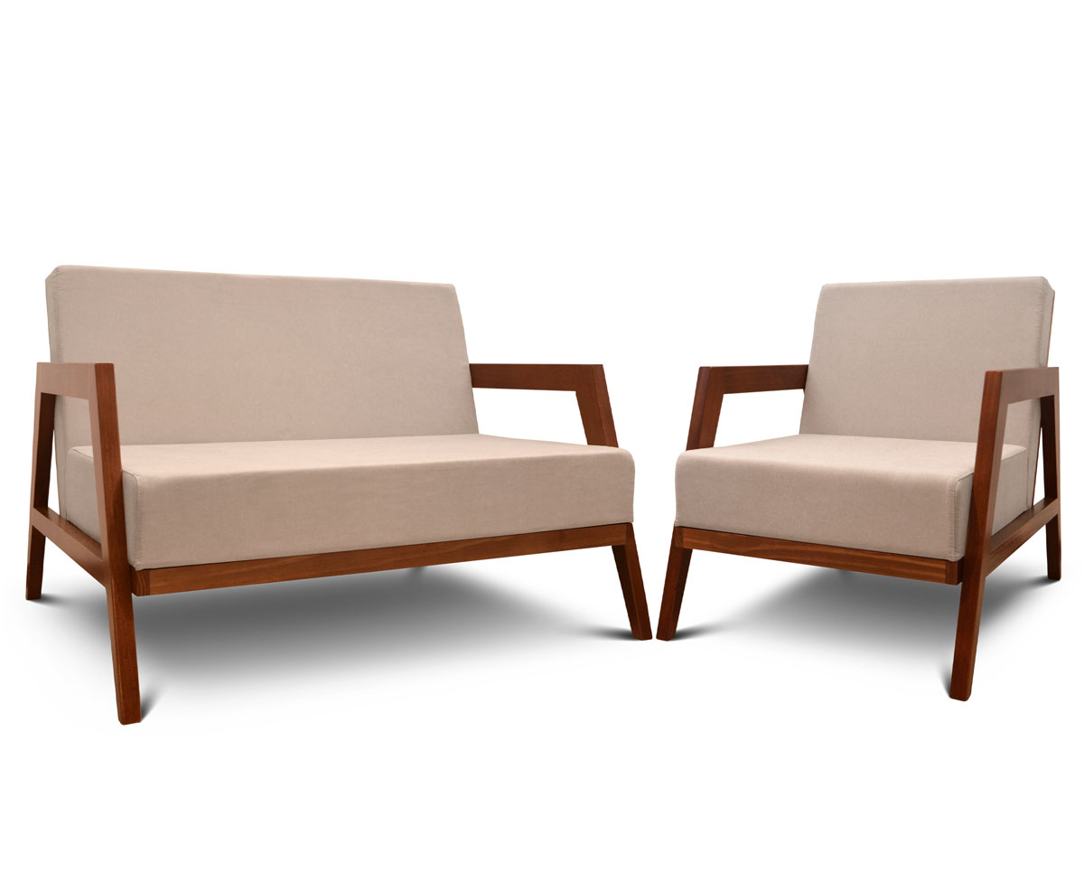 Juego de Living fabricado en madera maciza de Pino Clear. La rigurosa selección de la madera y su posterior tratamiento, dan como resultado un mueble de calidad, con betas más uniformes y un mínimo de nudos. Posee asiento y respaldo tapizados en tela de primera calidad. Variedad en colores de tela y lustres de madera.