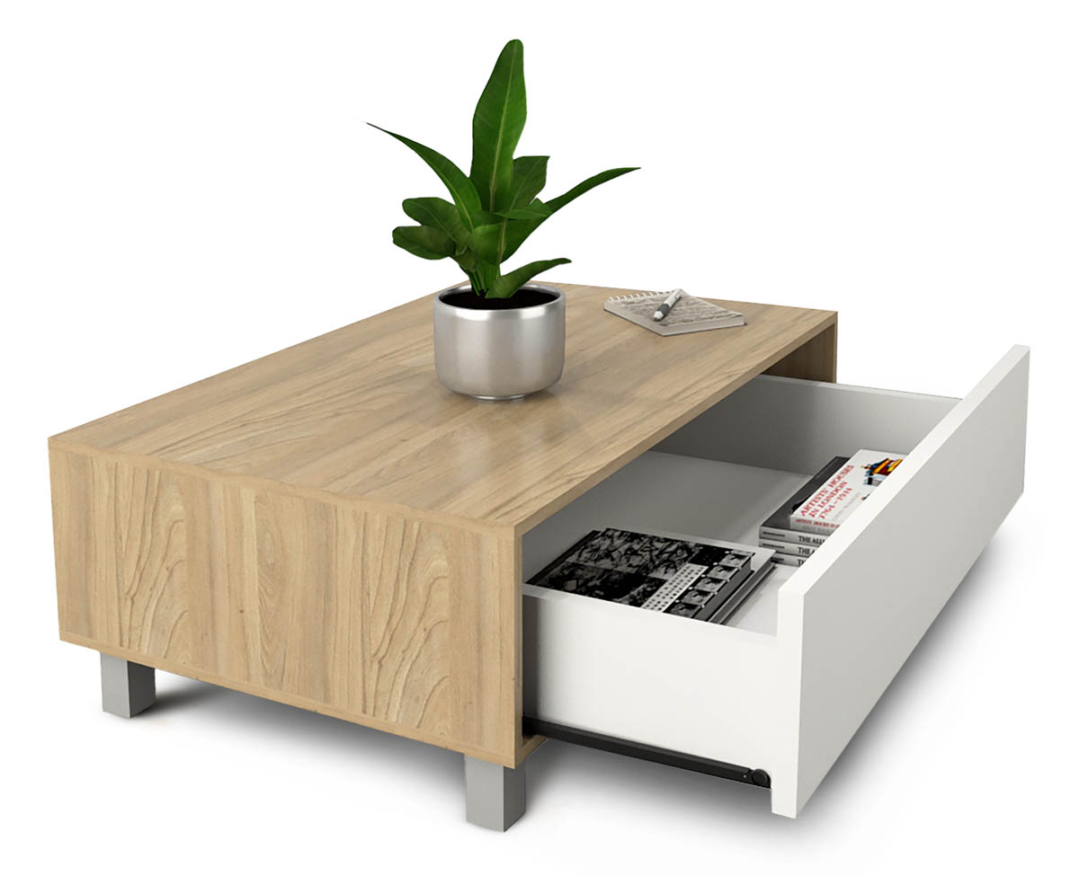 Mesa ratona para Living con cajón montado sobre correderas metálicas y Sistema Push. Fabricada en melamina de alta resistencia.