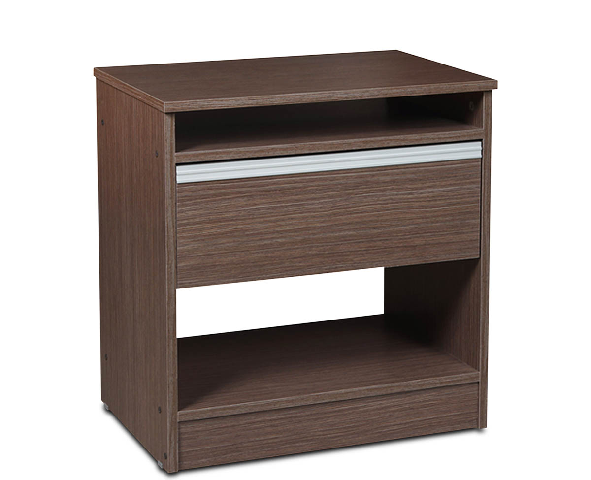 Mesa de Luz fabricada en melamina. Compuesta por 1 cajón y estante inferior. Detalle de cajón en aluminio.