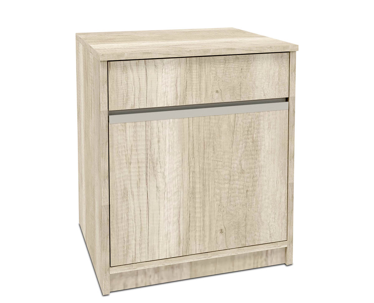 Mesa de luz fabricada en melamina. Cuenta con un cajón montado sobre correderas metálicas y una puerta con detalles en aluminio.