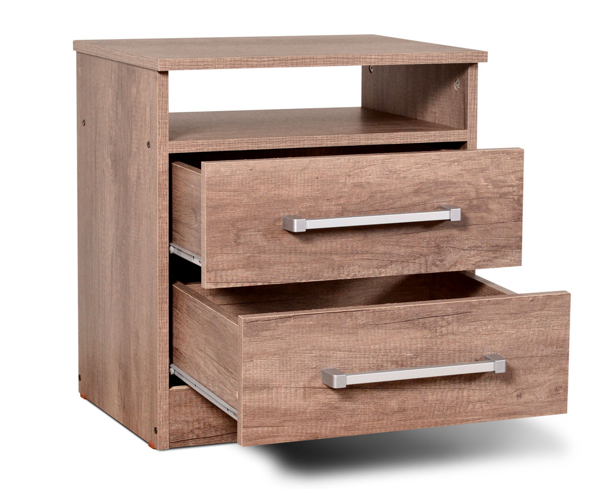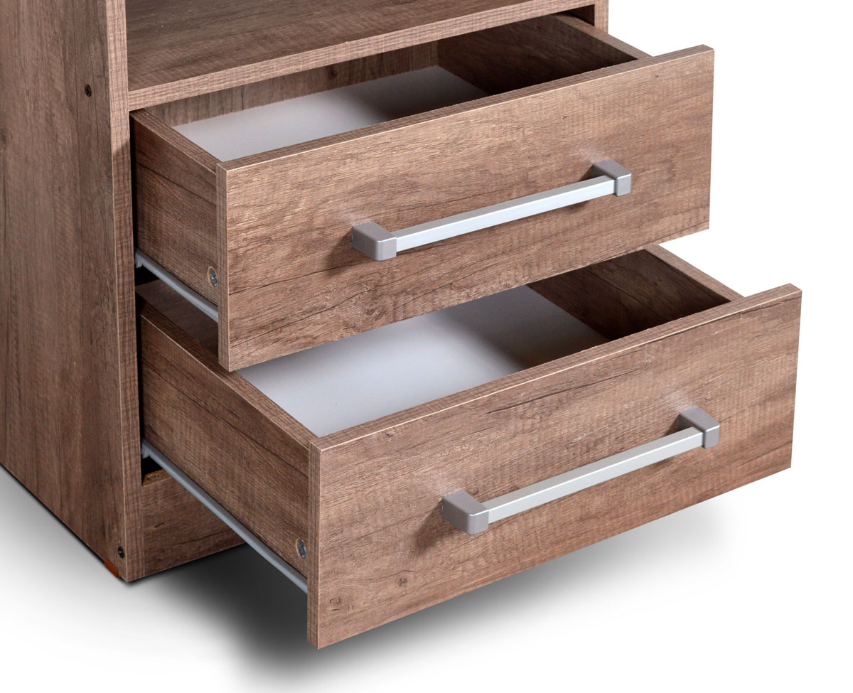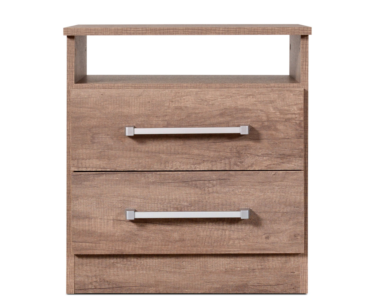 Mesa de Luz fabricada en melamina. Compuesta 1 estante y 2 cajones montados sobre correderas metálicas.