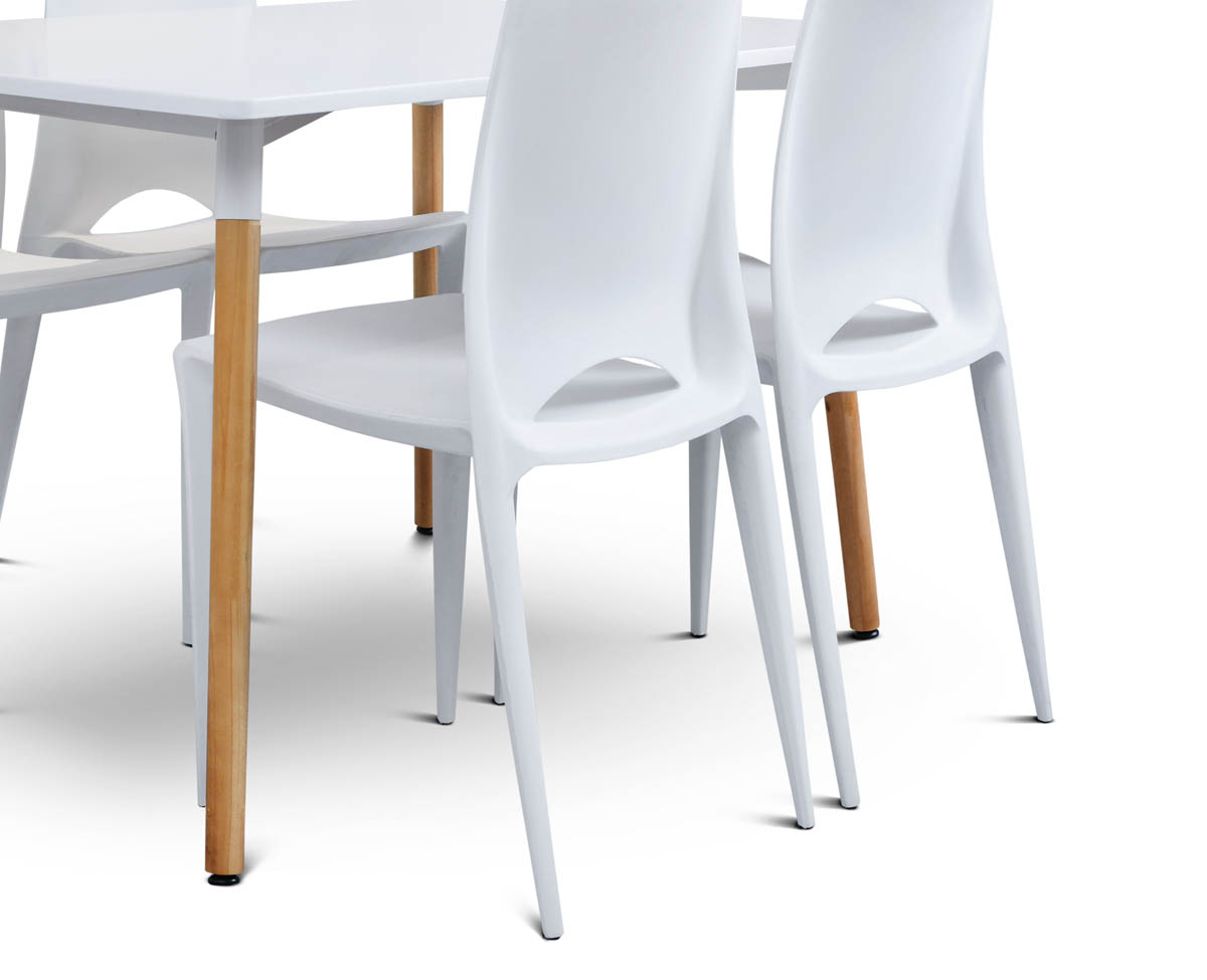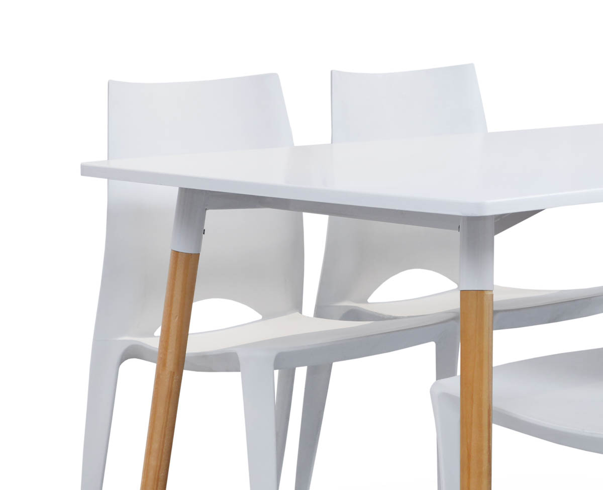 Mesa de comedor rectangular con patas en color madera natural y tapa de madera en color blanco.