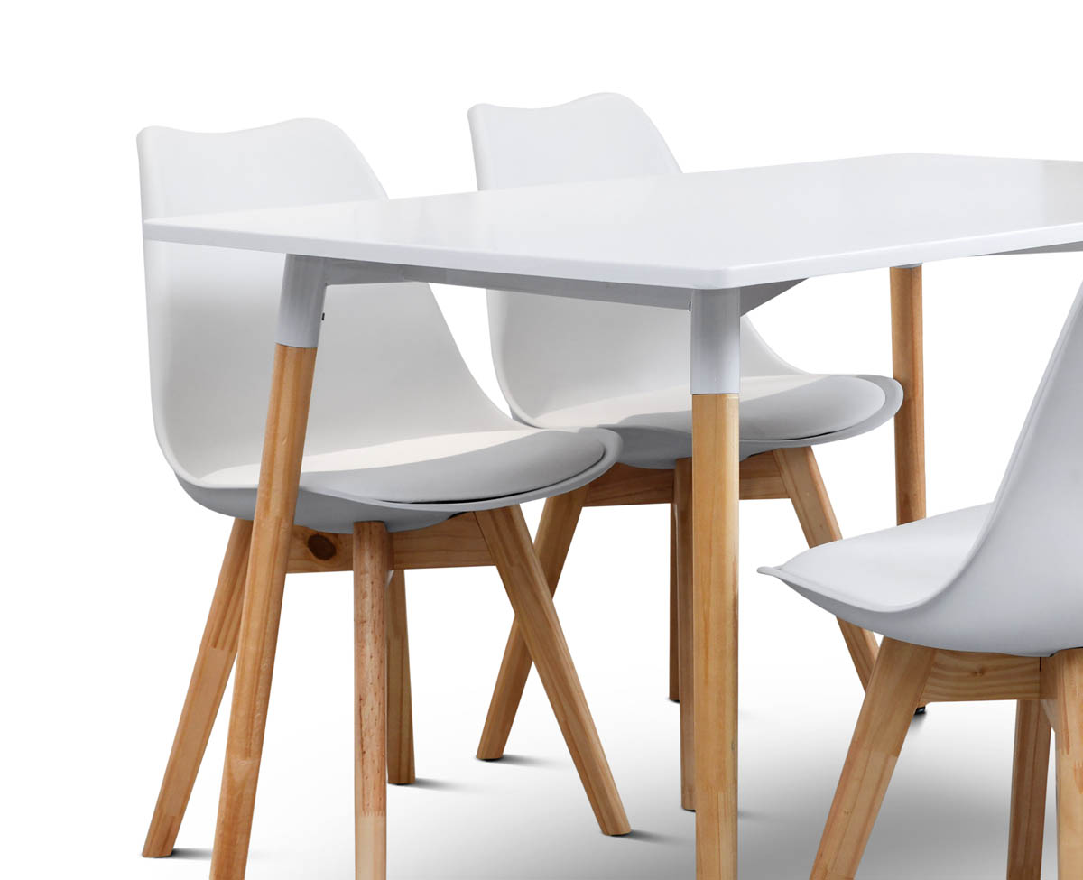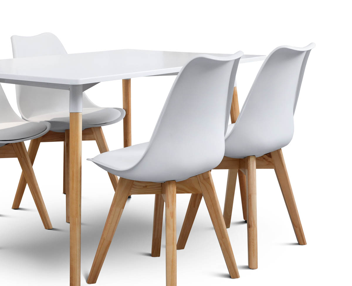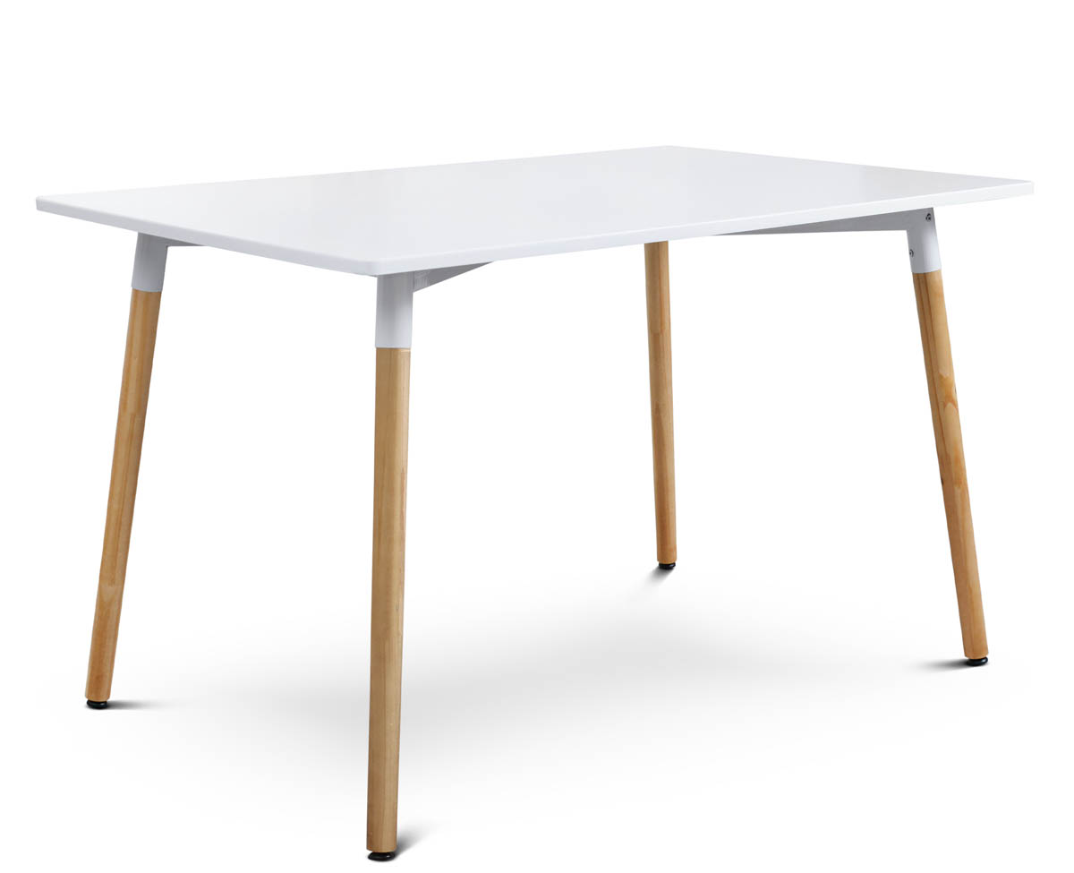 Mesa de comedor rectangular con patas en color madera natural y tapa de madera en color blanco.
