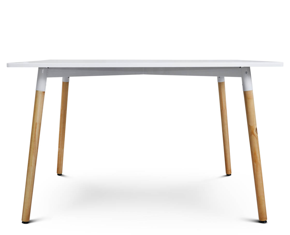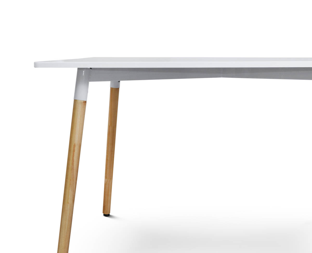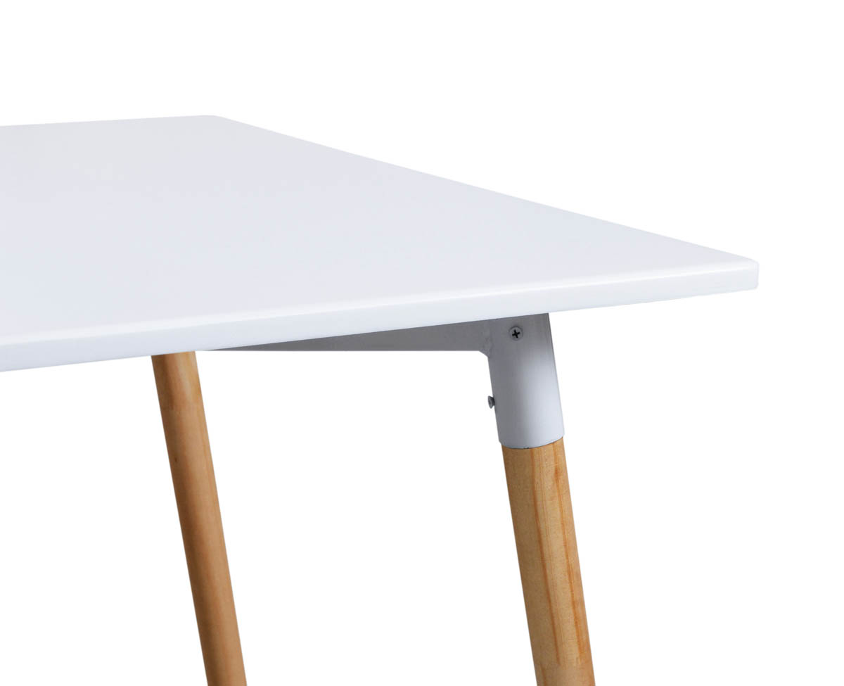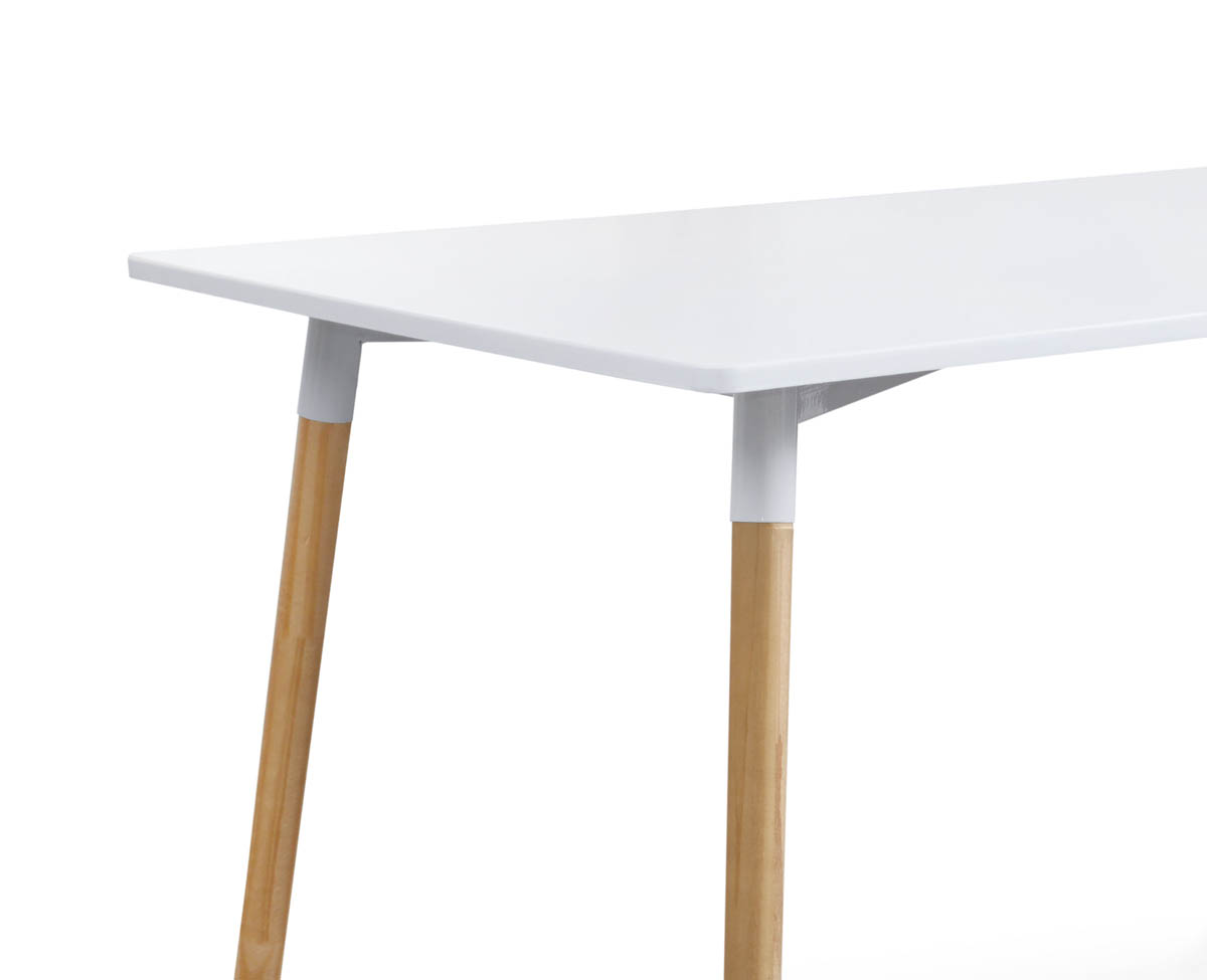 Mesa de comedor rectangular con patas en color madera natural y tapa de madera en color blanco.