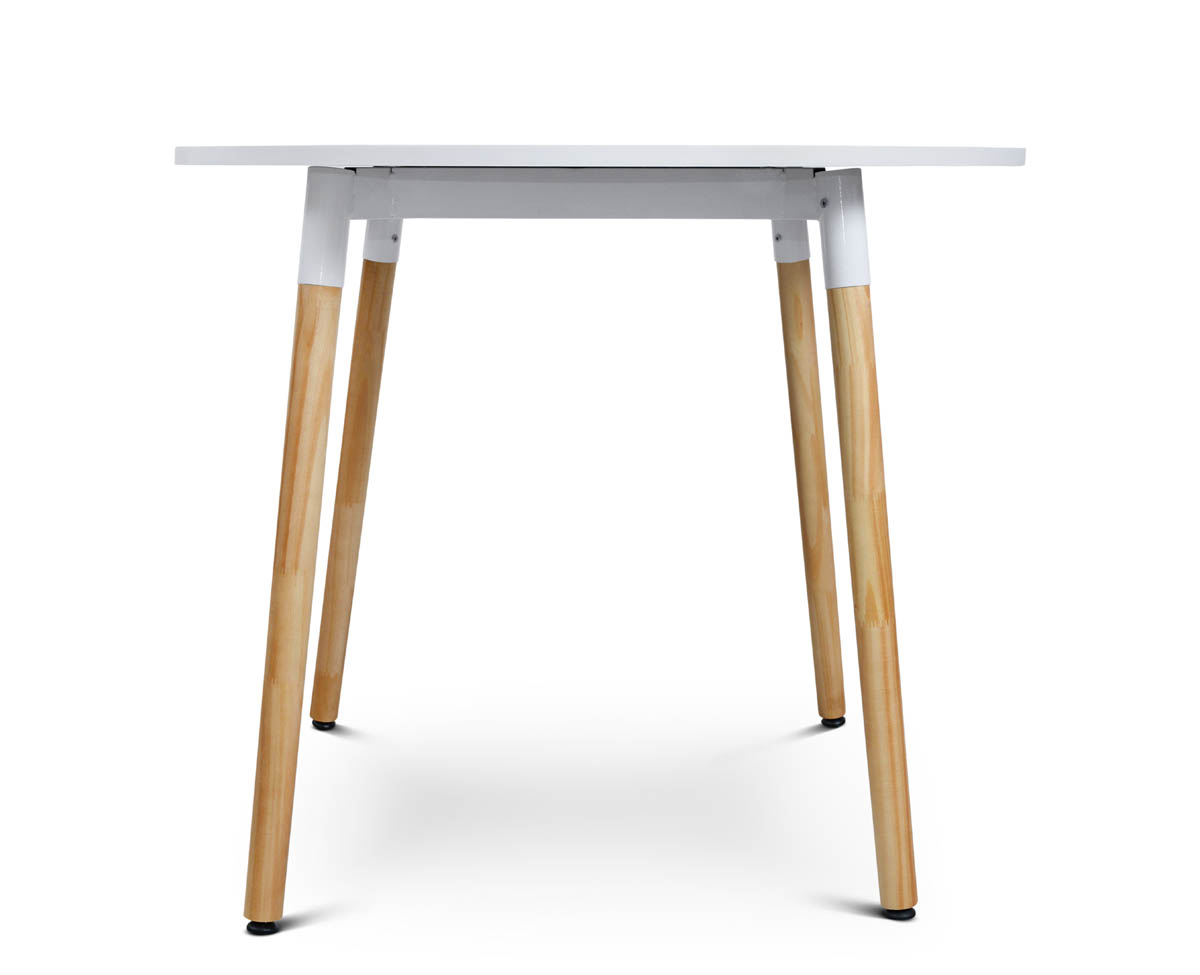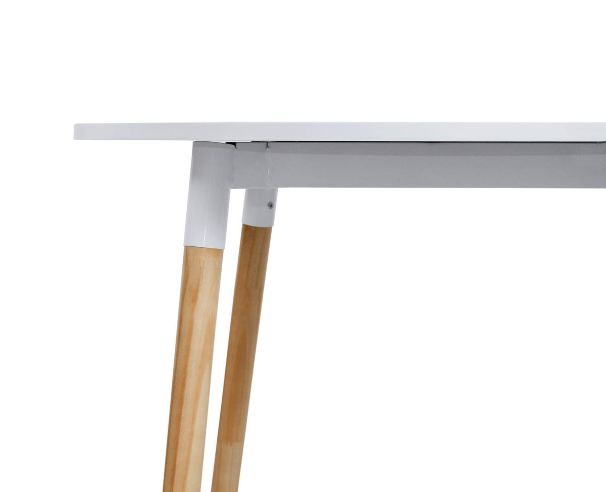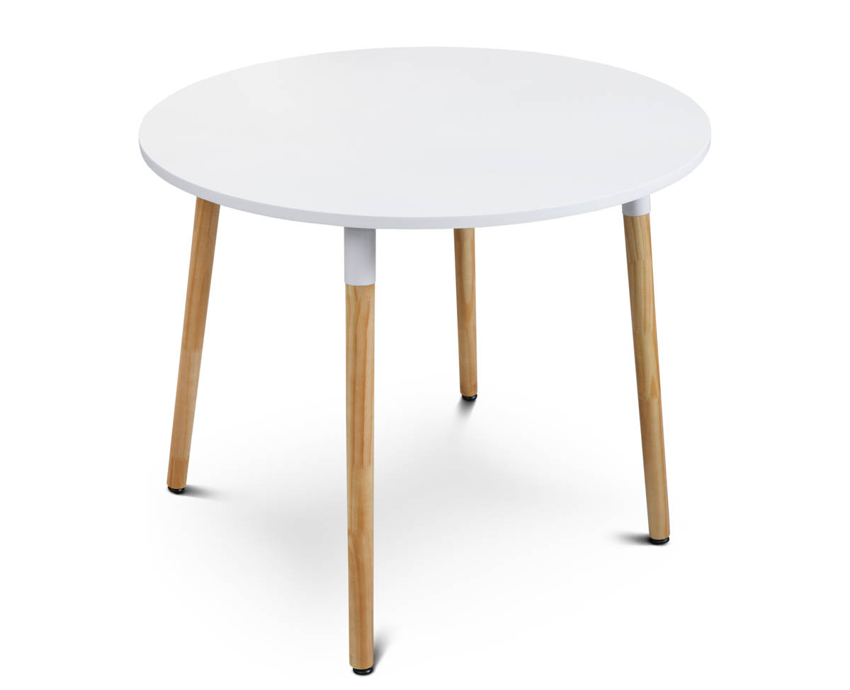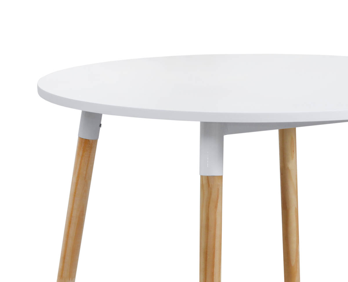 Mesa de comedor redonda con patas en color madera natural y tapa de madera en color blanco.