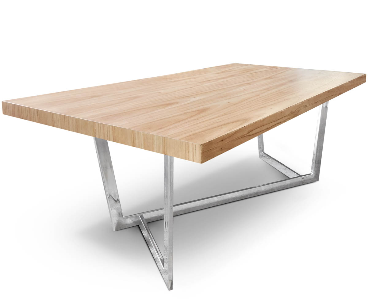Mesa de comedor rectangular fabricada en caño con terminación cromada y tapa de madera.