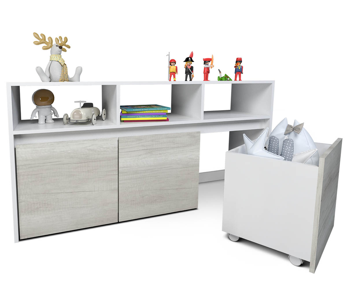 Modular fabricado en melamina. Cuenta con estantes y 3 cajones con ruedas.