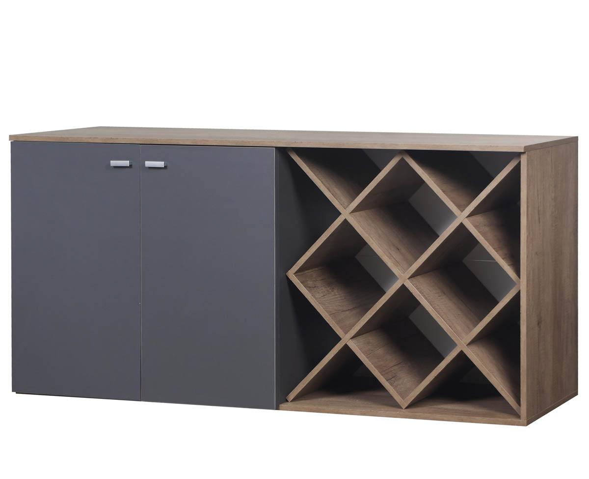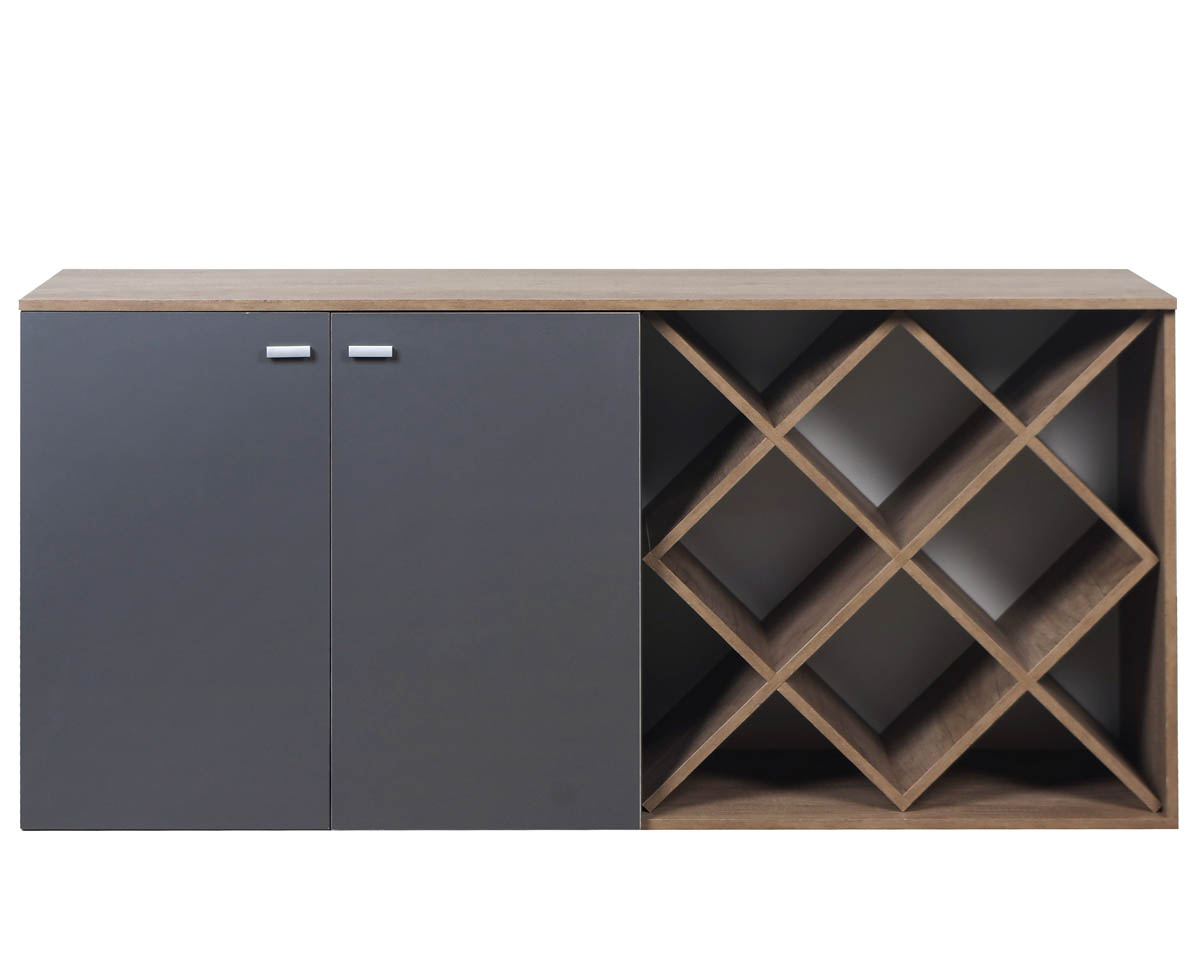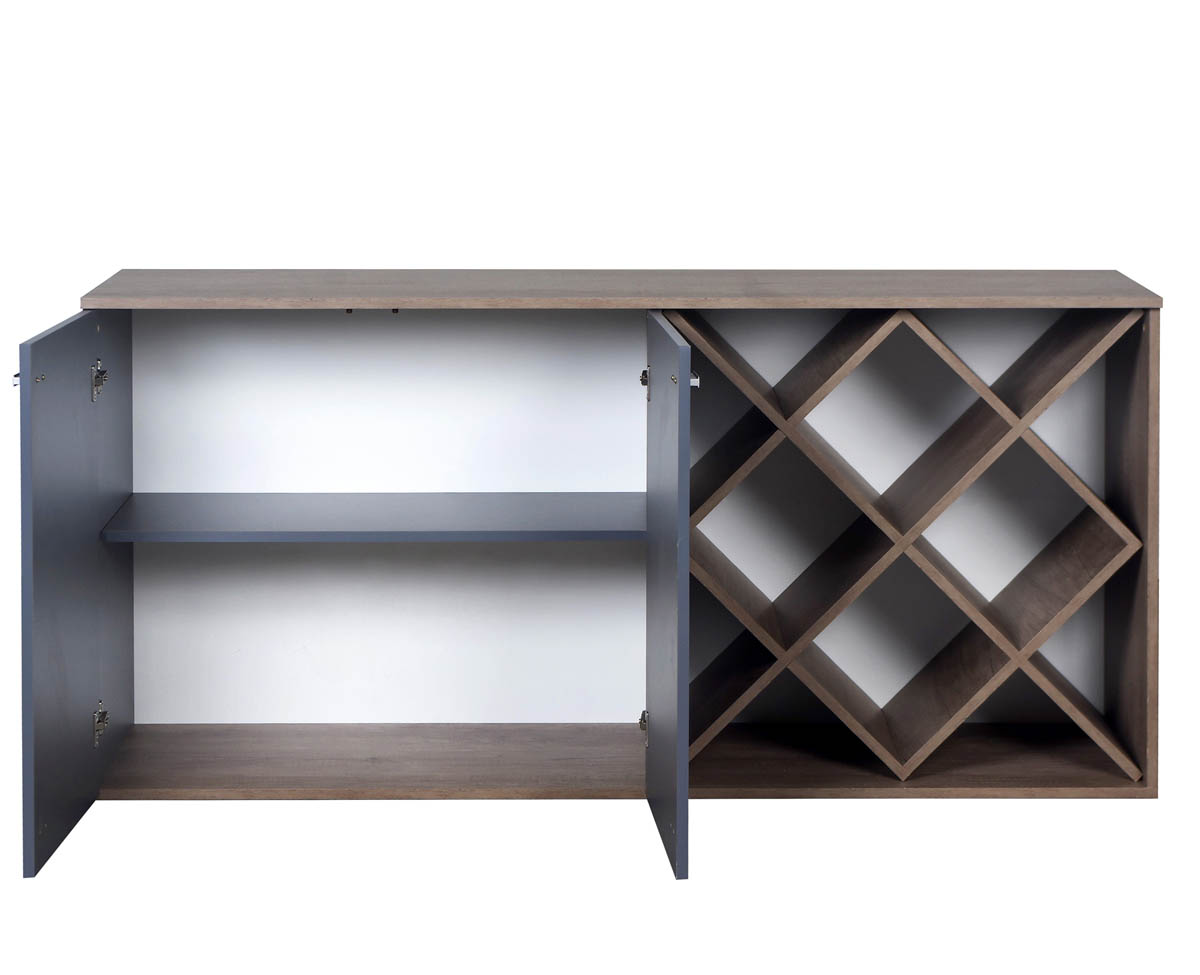 Rack con bar fabricado en MDF con 2 puertas y espacios de guardado para botellas. Tiradores de diseño minimalista y bisagras con cierre automático.