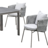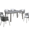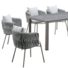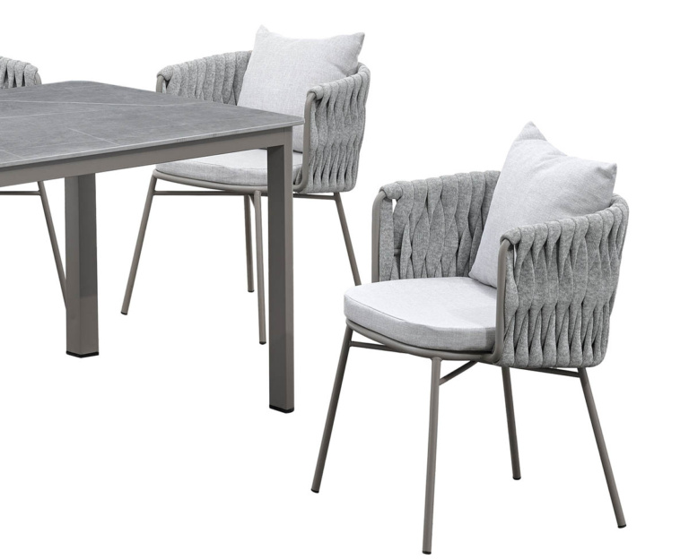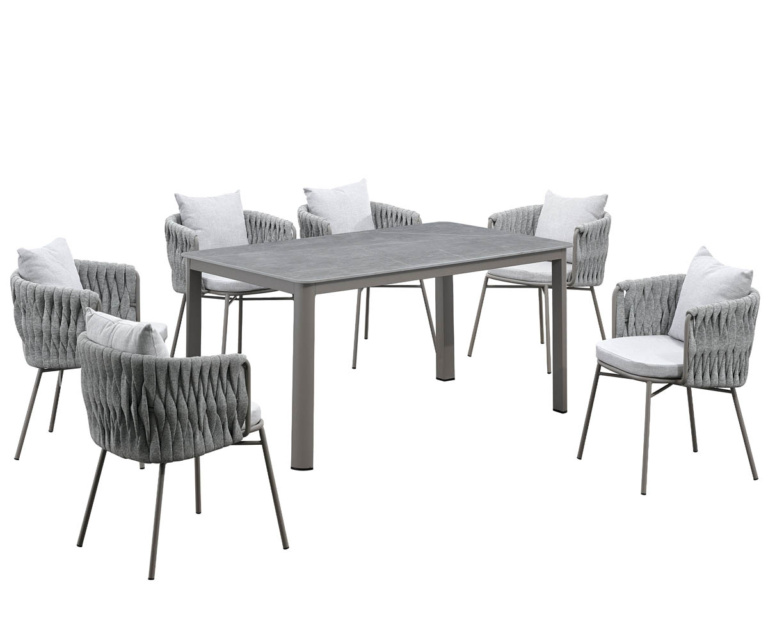 Juego de comedor apto para aire libre. Estructura metálica. Tapa silestone. Símil ratán trenzado.