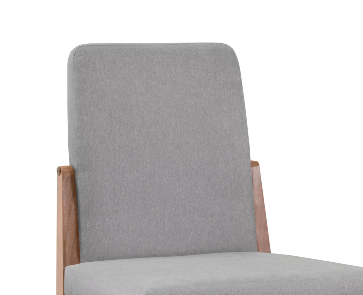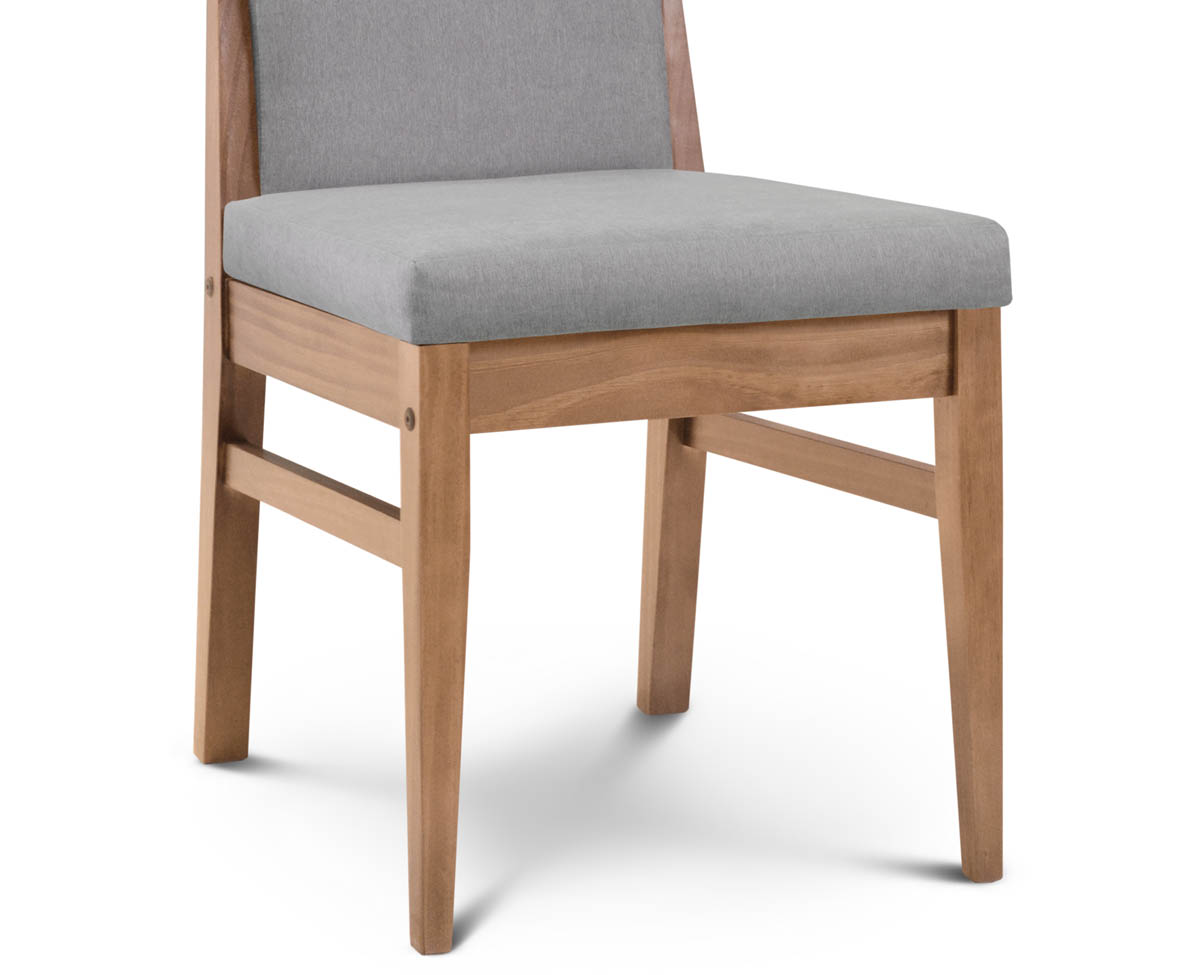 Silla fabricada en madera maciza de Pino Clear. Tapizada con tela Sunny.