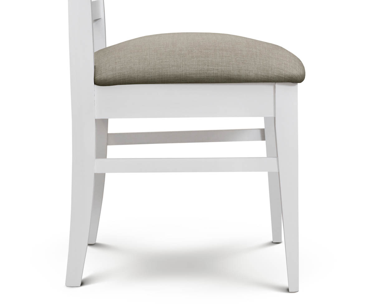 Silla de madera maciza con asiento tapizado en tela Aspen. Fabricada en madera maciza de Pino Clear. La rigurosa selección de la madera y su posterior tratamiento, dan como resultado un mueble de calidad, con betas más uniformes y un mínimo de nudos.