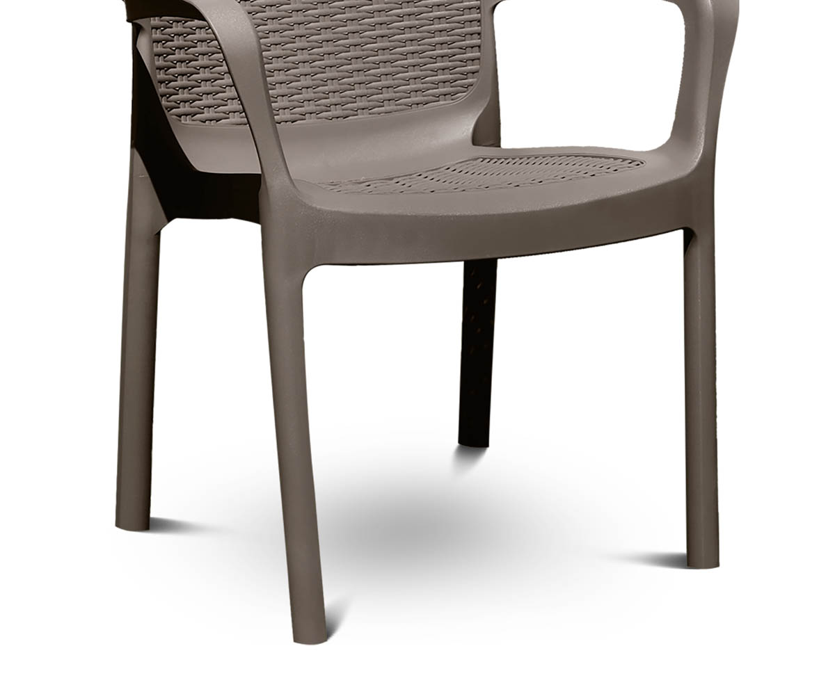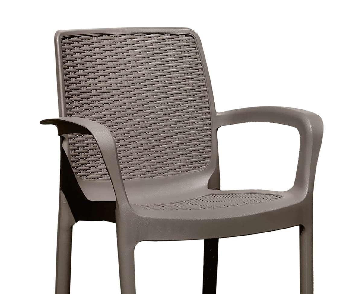 Silla simil ratán plástica con apoyabrazos. Resiste hasta 135 Kg.