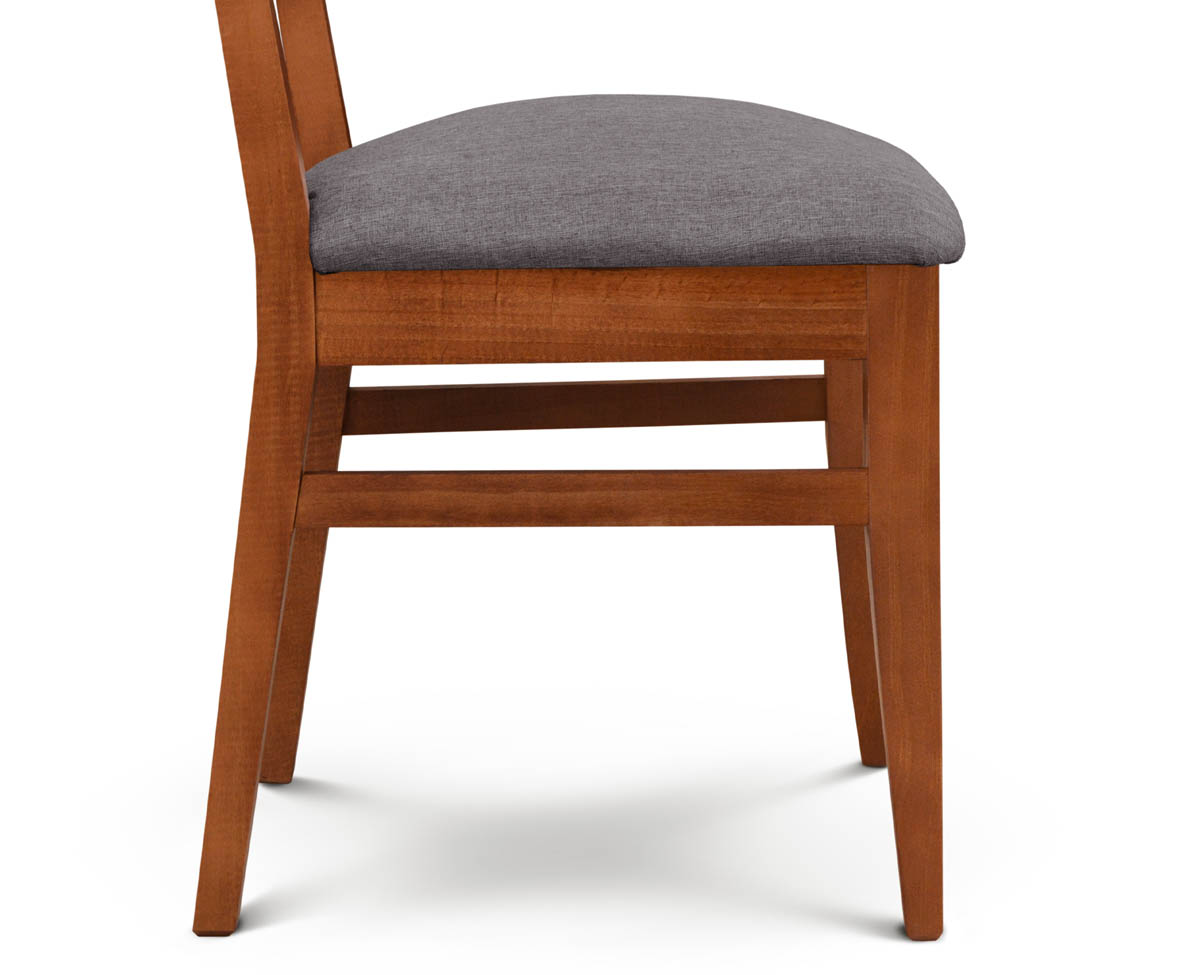 Silla de madera maciza con asiento tapizado en tela Shot antimanchas. Fabricada en madera maciza de Pino Clear. La rigurosa selección de la madera y su posterior tratamiento, dan como resultado un mueble de calidad, con betas más uniformes y un mínimo de nudos.