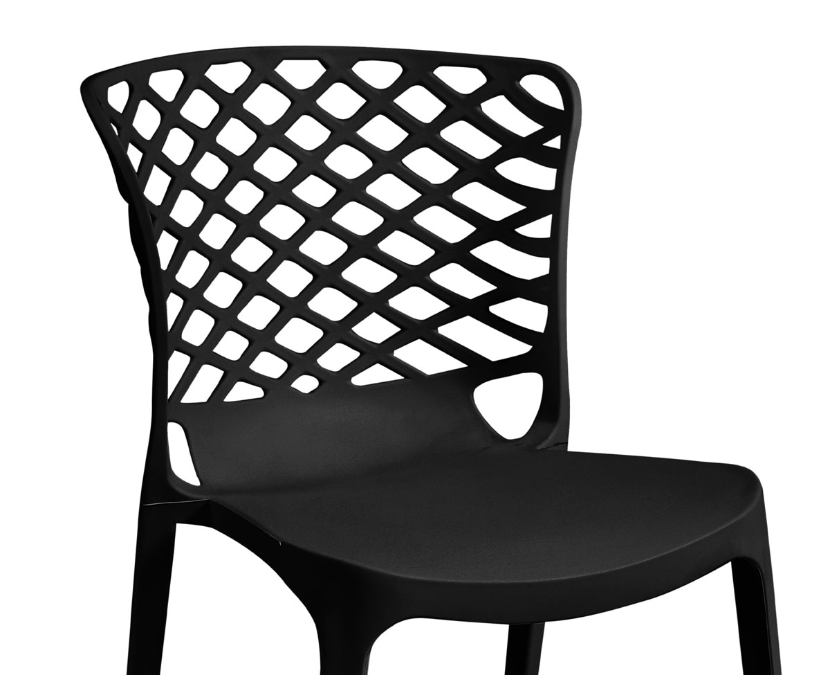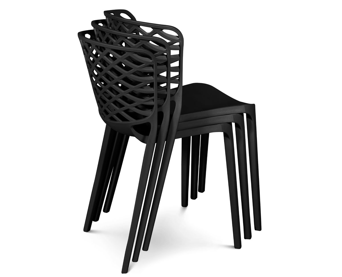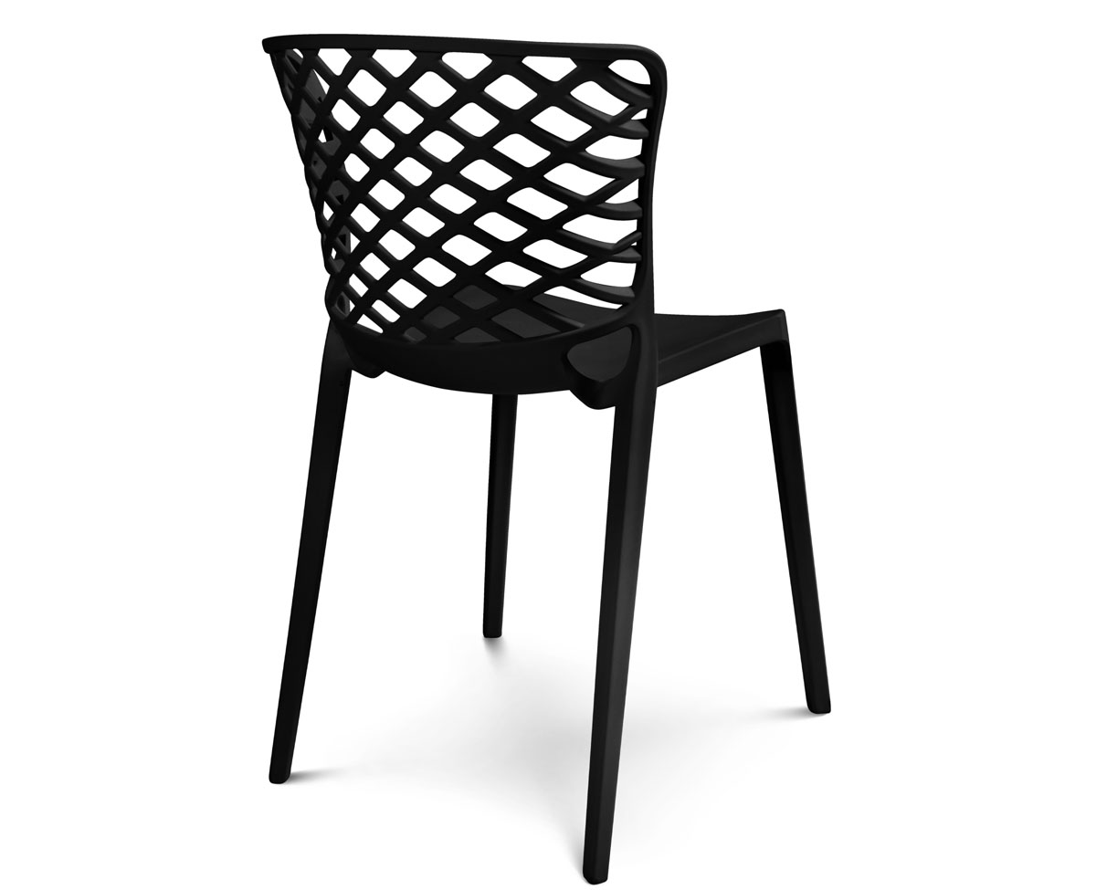 Silla de diseños curvos fabricada en polipropileno de gran resistencia para el uso interior y para exterior. Diseño de silla apilable.