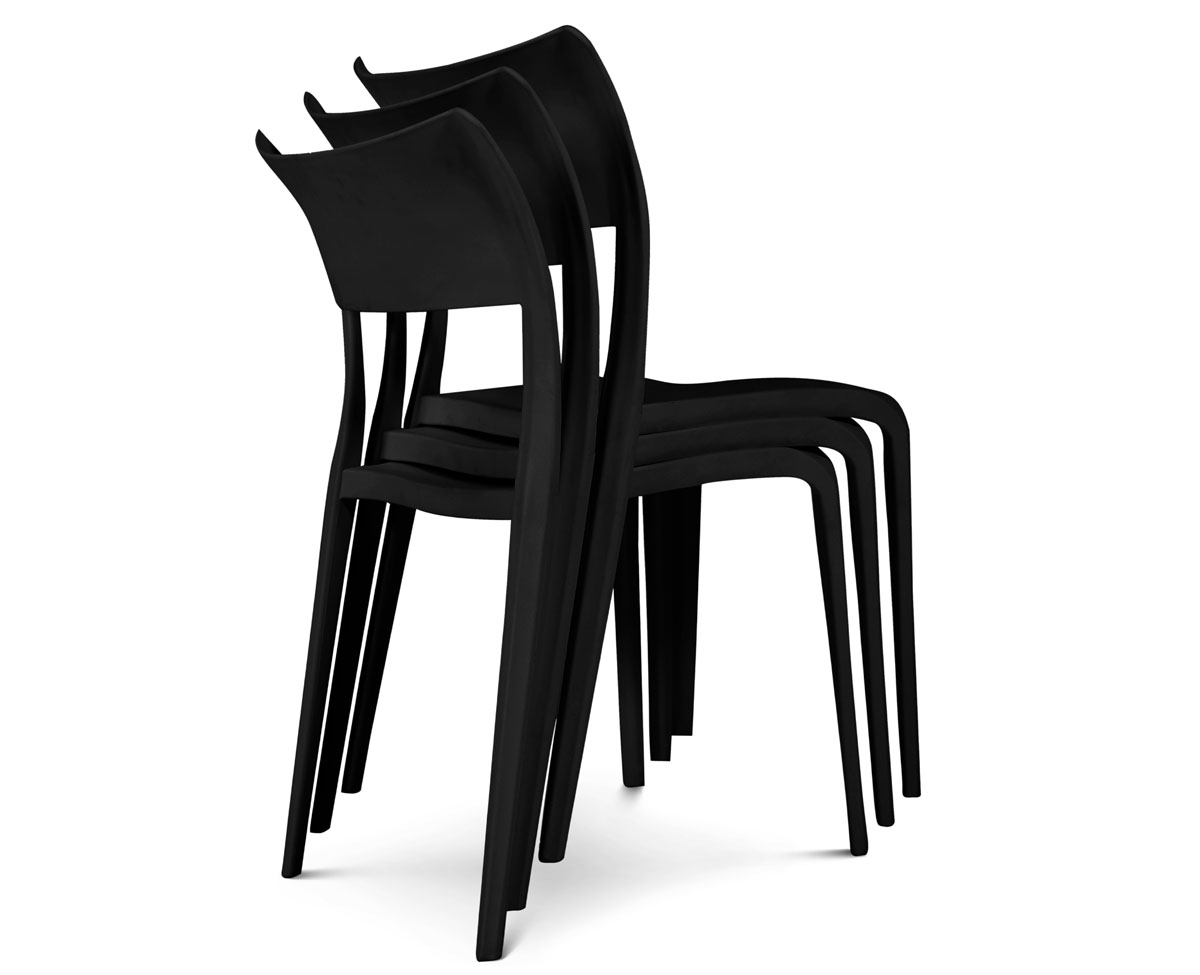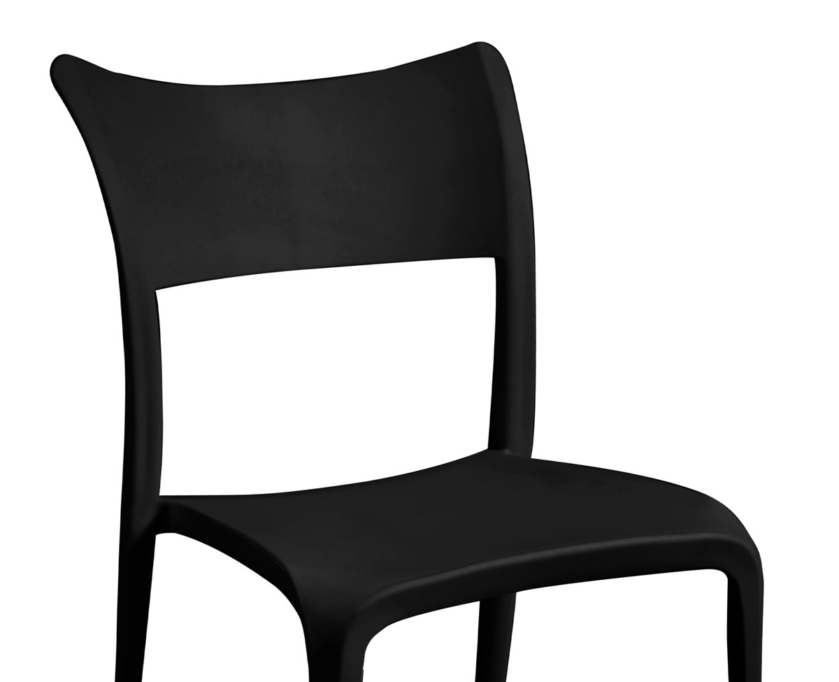 Silla de diseños curvos fabricada en polipropileno de gran resistencia para el uso interior y para exterior. Diseño de silla apilable. Soporta hasta 150 Kg.