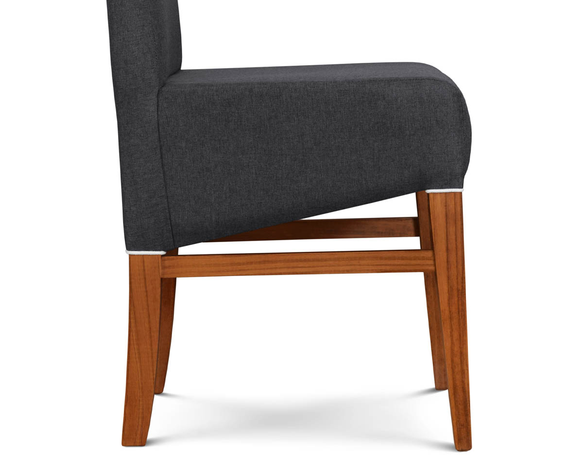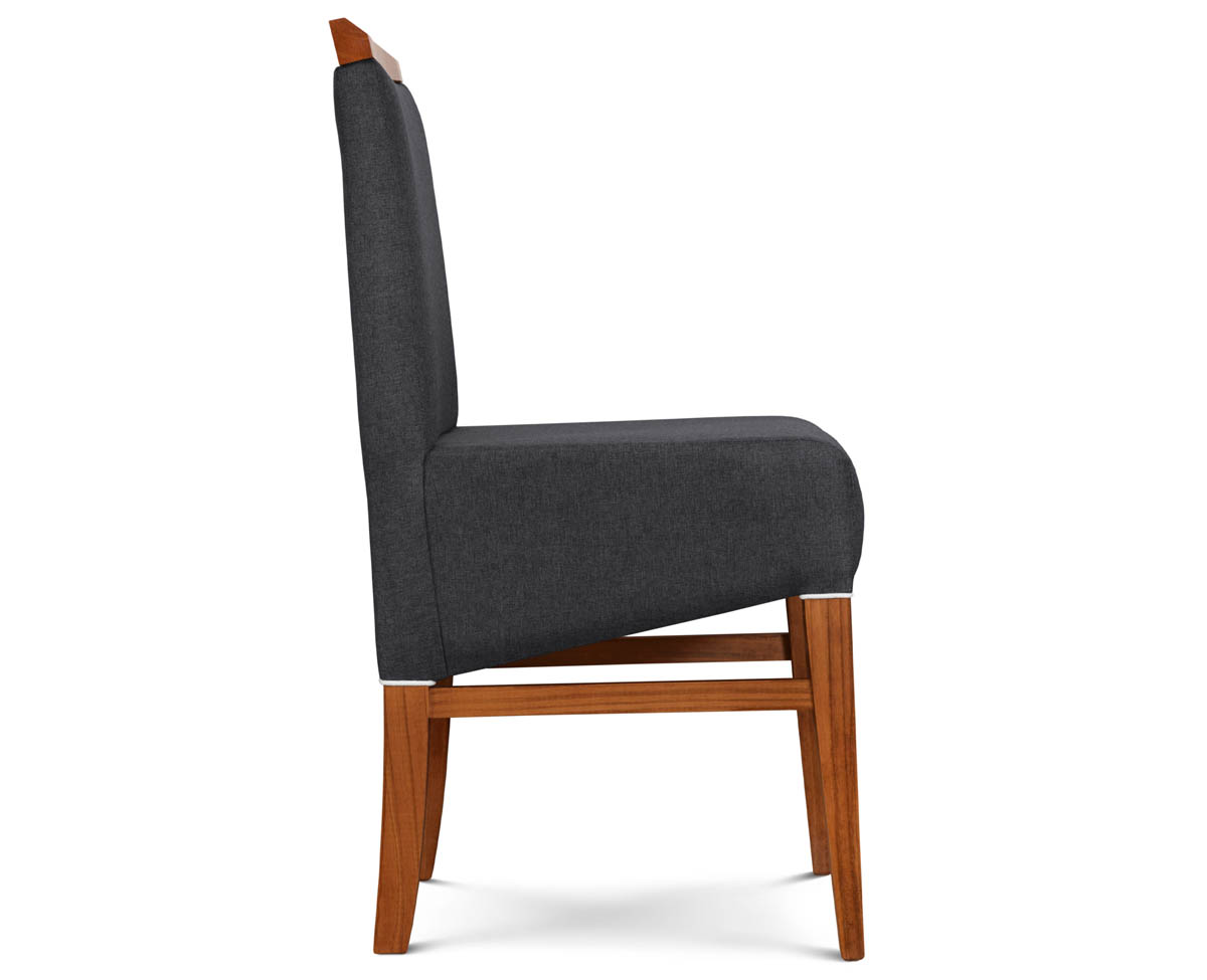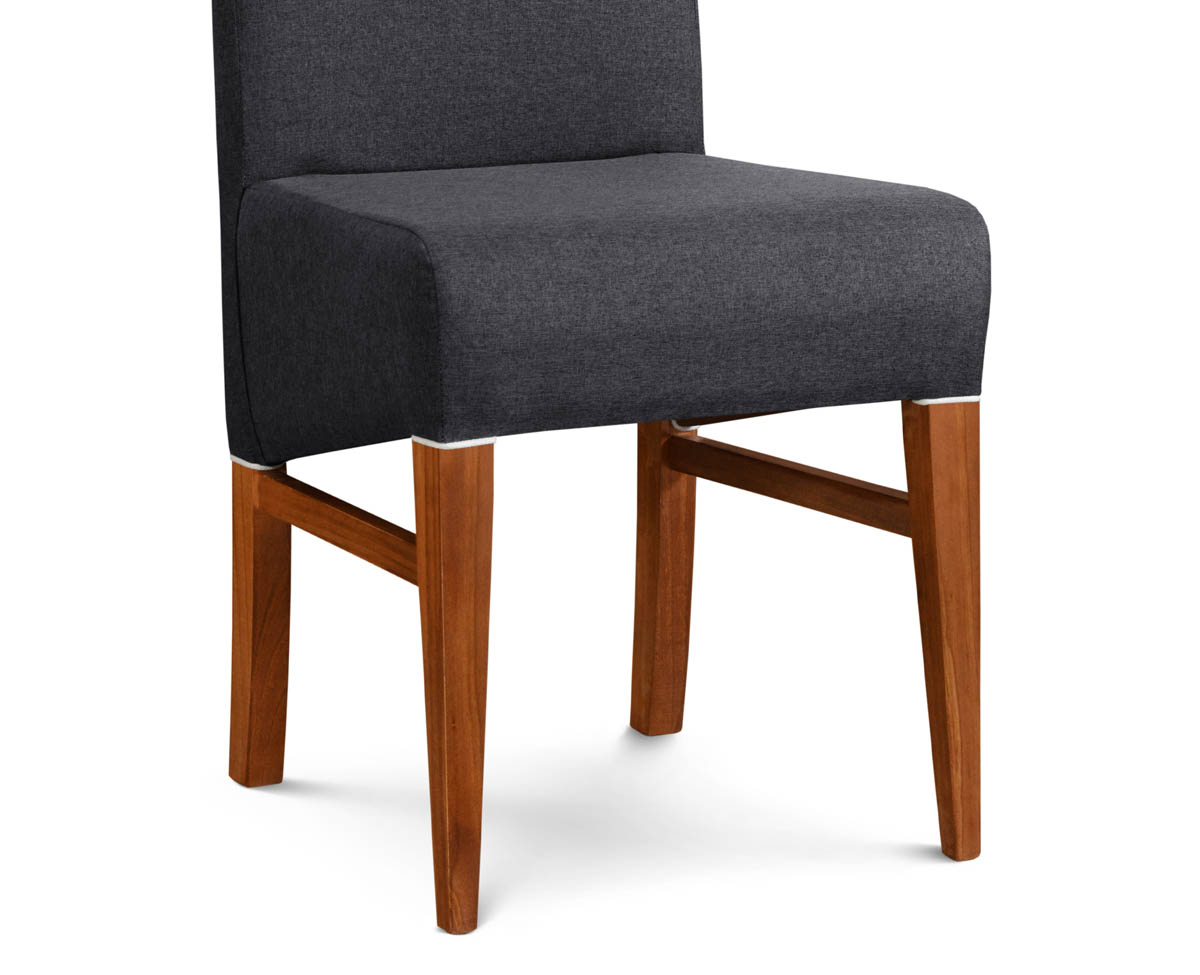 Fabricada en madera maciza de Pino Clear. Asiento y respaldo tapizados en tela Shot Antimanchas.