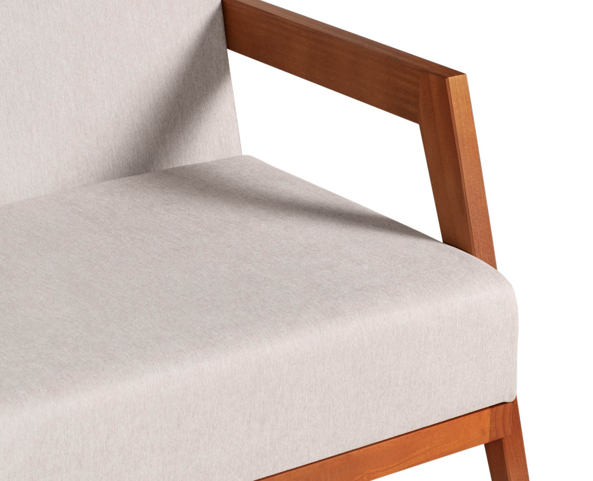 Fabricado en madera maciza de Pino Clear. La rigurosa selección de la madera y su posterior tratamiento, dan como resultado un mueble de calidad, con betas más uniformes y un mínimo de nudos. Posee asiento y respaldo tapizados en tela Shot Antimanchas. Variedad en Colores.