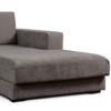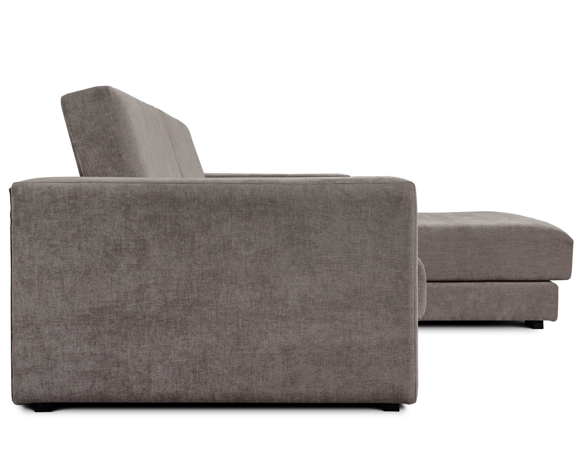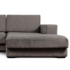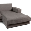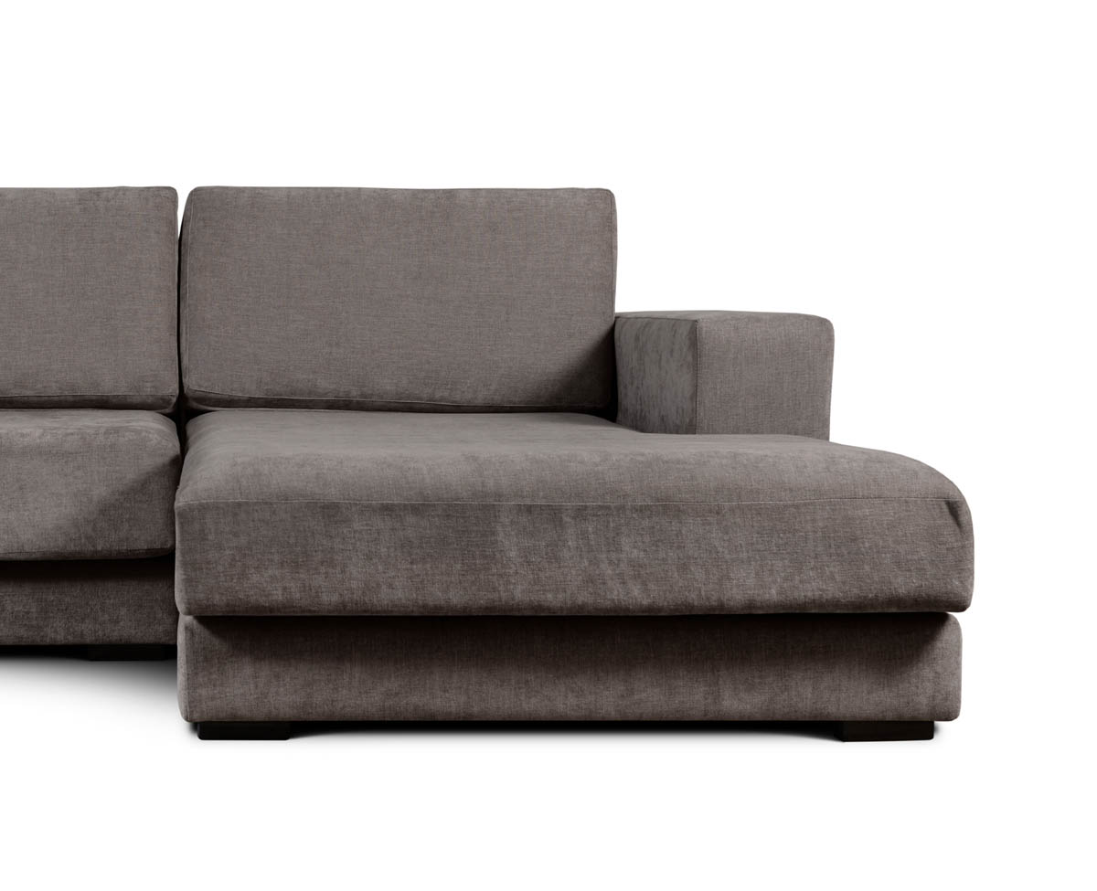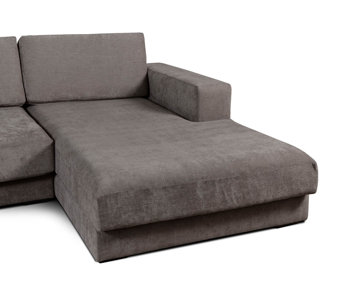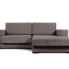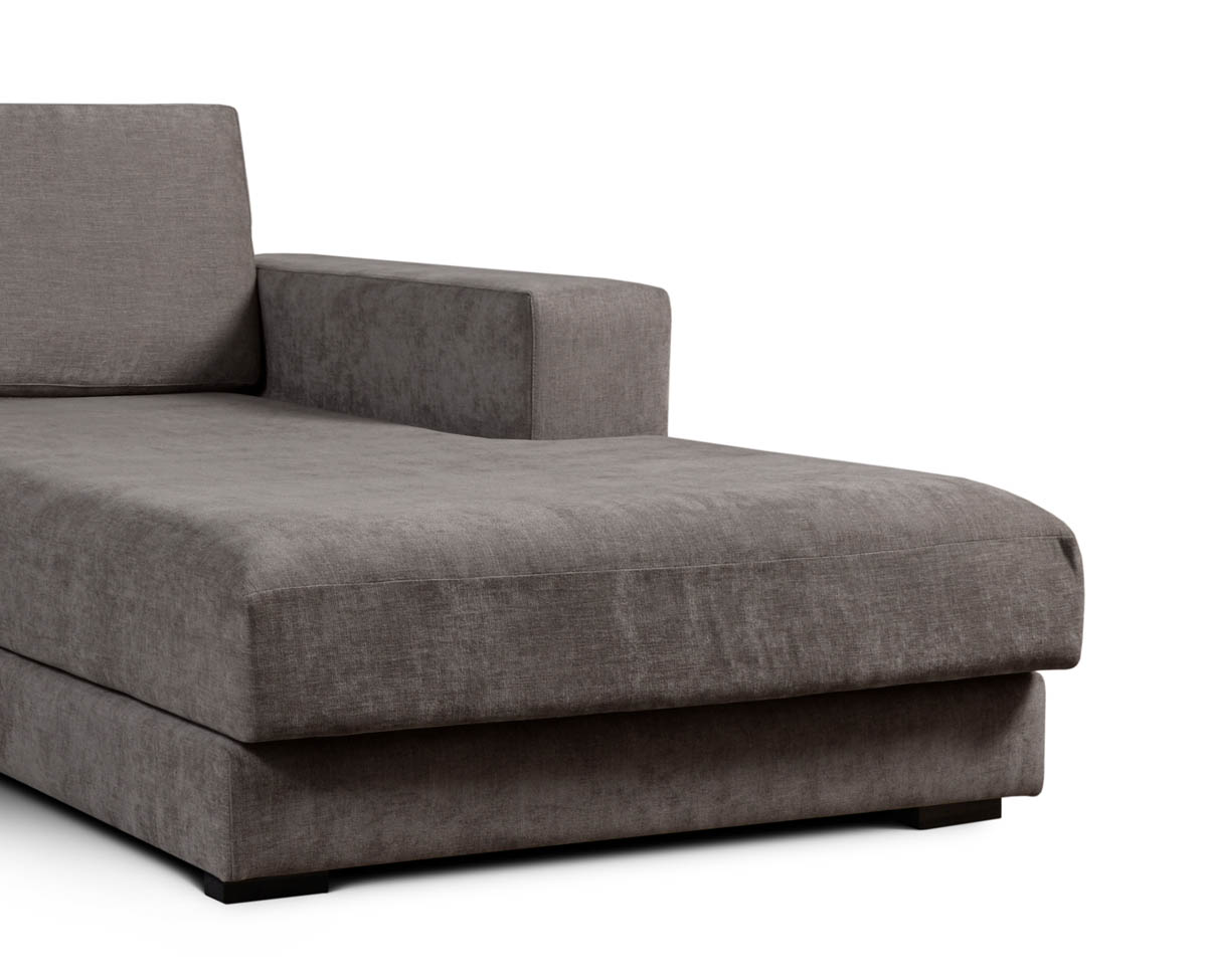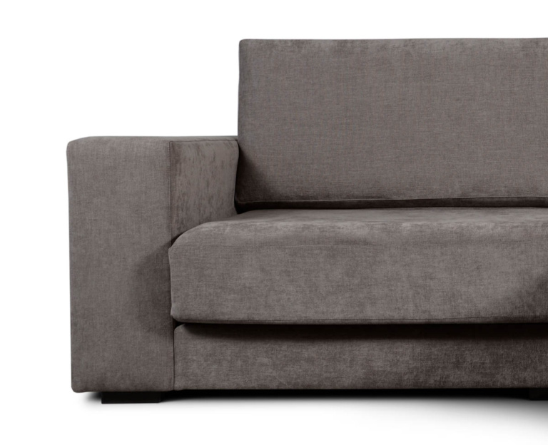 Tapizado en tela Million, su estética minimalista se complementa con líneas limpias, apoyabrazos amplios y un chaise longue integrada que invita al descanso. Los almohadones de asiento y respaldo, de proporciones generosas, aseguran una experiencia envolvente, mientras que sus patas cortas en bloque negro aportan estabilidad y un toque contemporáneo.